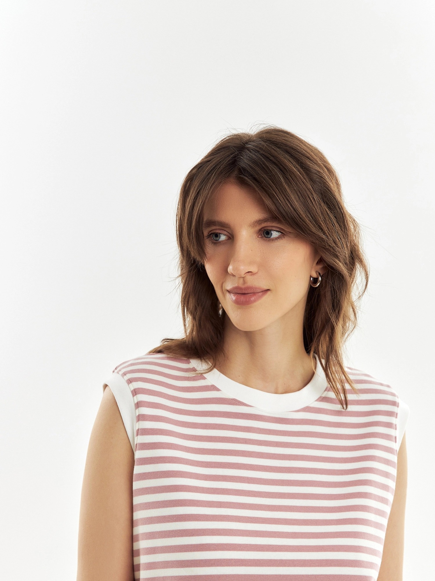 Топ из трикотажа в нежную розово-белую полоску, прямого силуэта, плечо расширено. Идеален для составления стильных кажуальных образов.