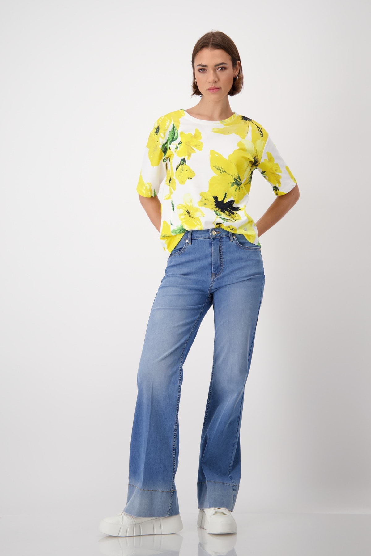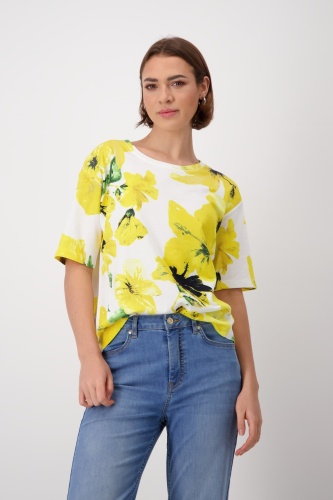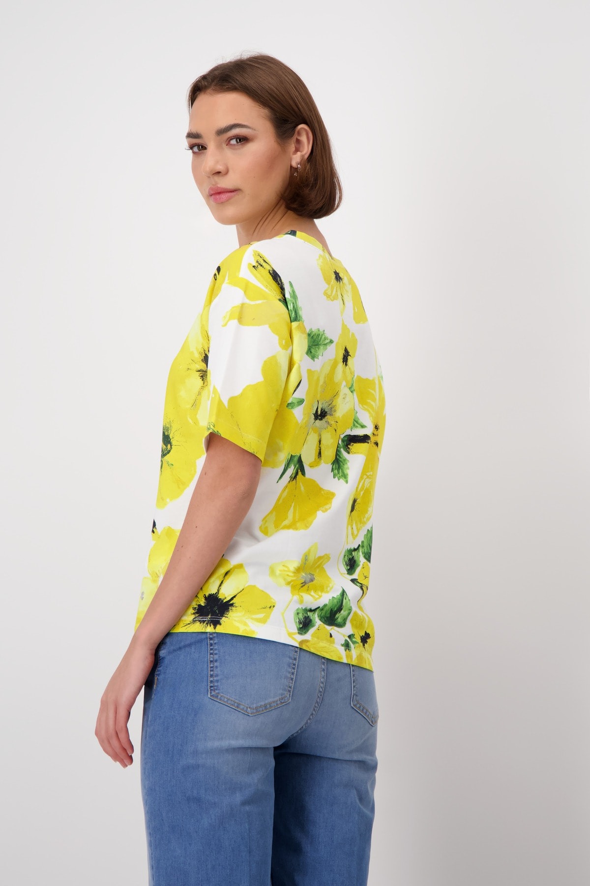 Футболка с цветочным принтом по всей поверхности изготовлена из высококачественной смеси хлопка и создает свежий и женственный образ. Регулярная посадка. Круглый вырез. Короткий рукав. Удлиненная закругленная спина. Длина спинки 44-го размера составляет 65 см, длина переда 62 см.