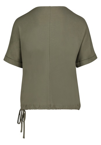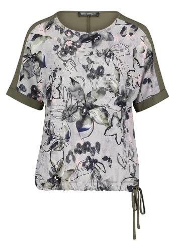 Футболка свободного покроя создает демократичный образ. Круглый вырез горловины, цельнокроеные рукава 1/2 с фиксированными манжетами, низ изделия оформлен кулиской. Утонченный принт с цветочными мотивами спереди контрастирует с однотонной спинкой. Декор стразами создает блестящие акценты. Материал из вискозной смеси приятен к телу и обеспечивает комфорт.