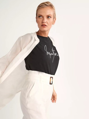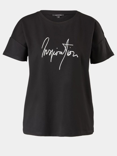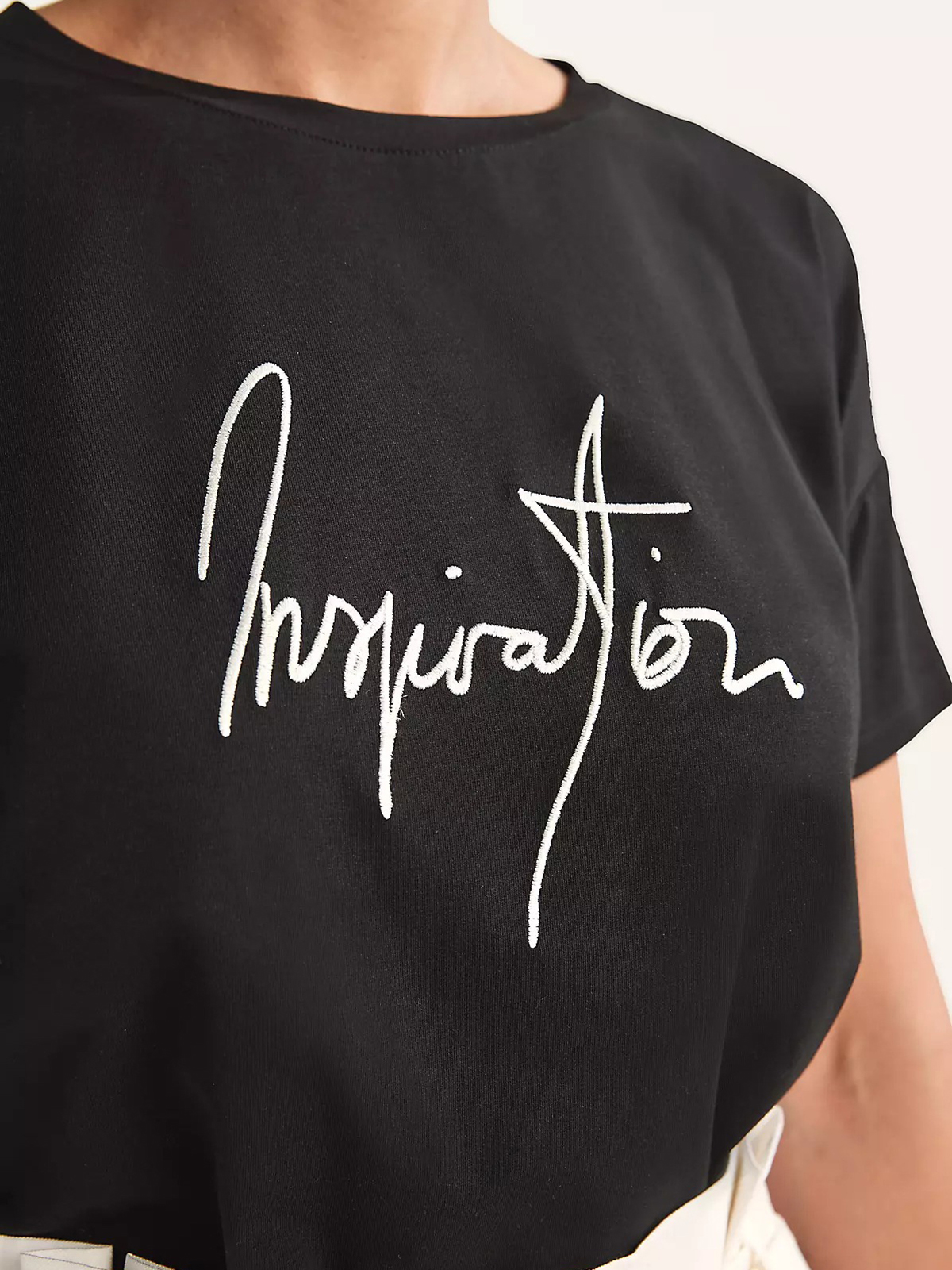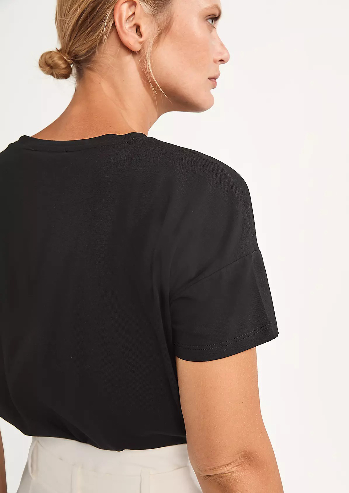 Однотонная черная футболка с принтом на груди. Материал из смесового хлопка обеспечивает хорошую посадку изделия по фигуре. Круглый вырез горловины, короткий втачной рукав.