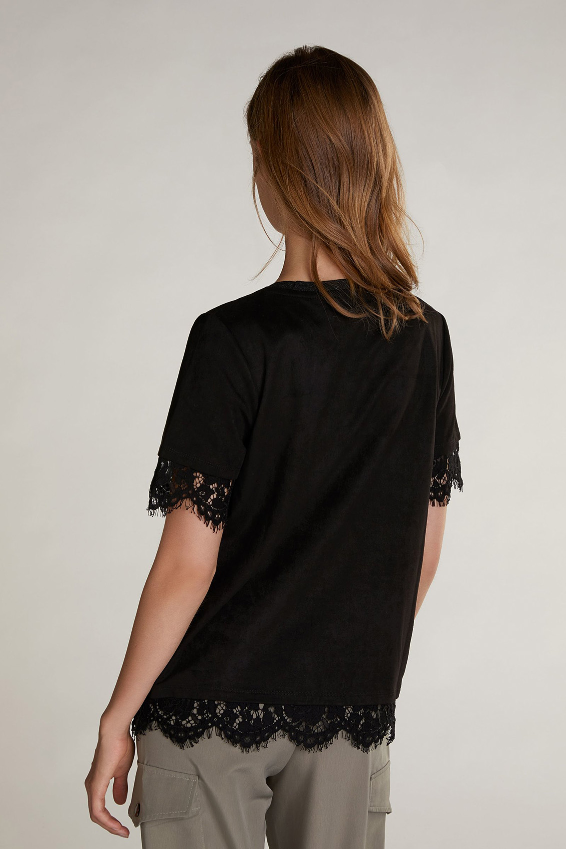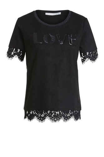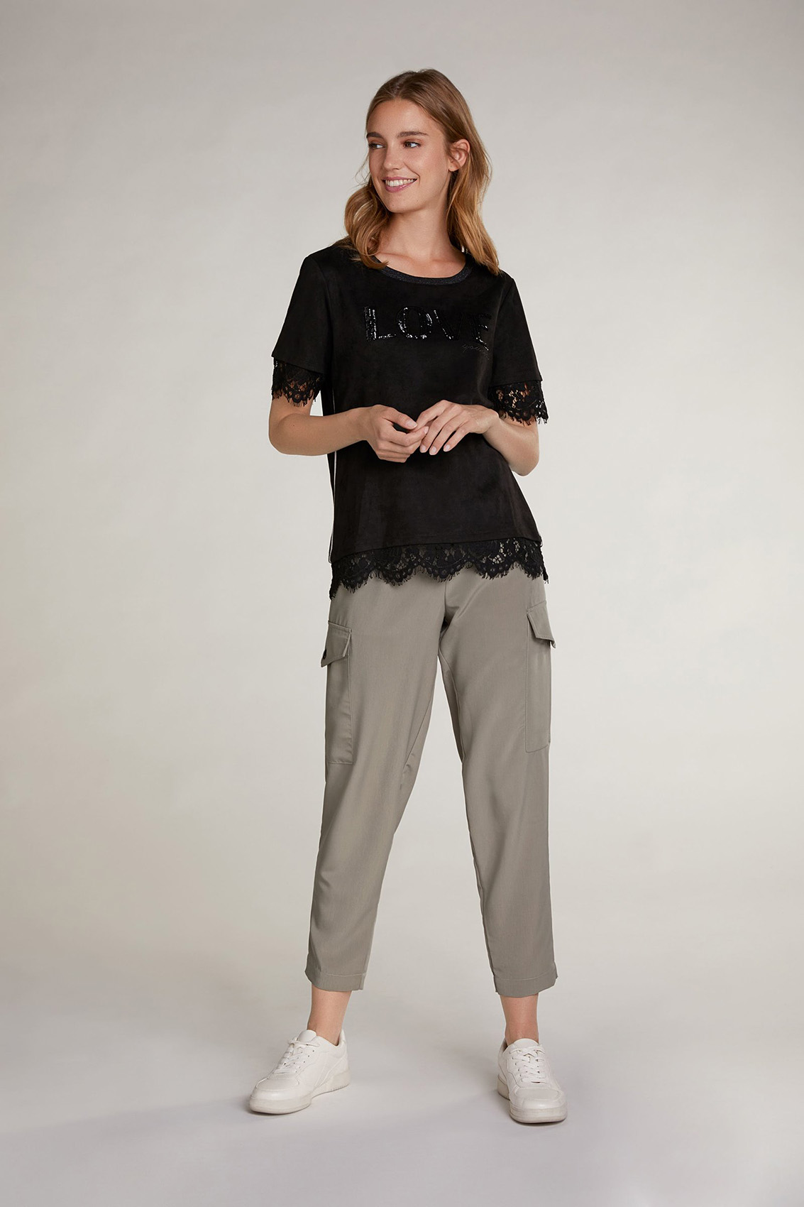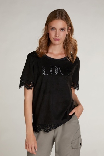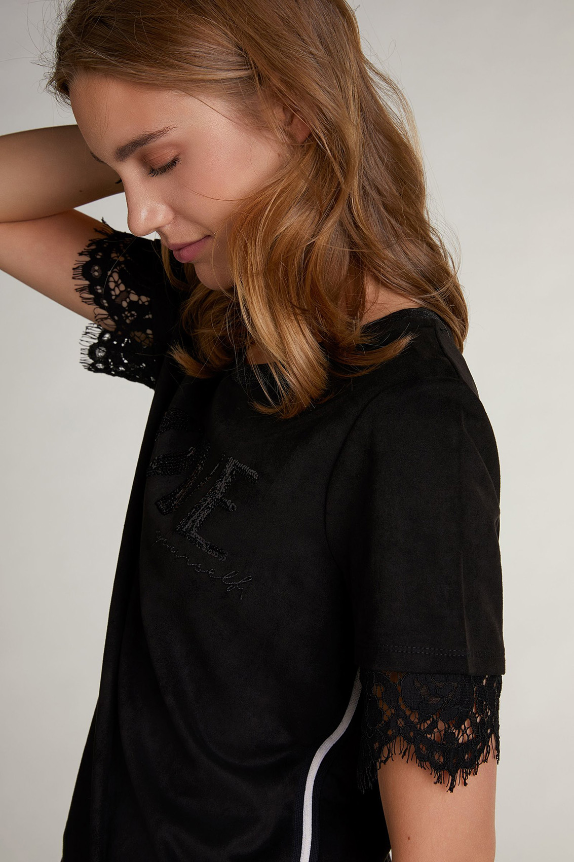 Футболка прямого покроя. Круглый вырез горловины с обтачкой с нитью люрекса. Короткие втачные рукава. Кружевная отделка рукавов и низа изделия подчеркивает женственность образа. Вышивка пайетками придает ненавязчивый блеск. Еще один модный элемент дизайна - лампасы вдоль боковых швов футболки.