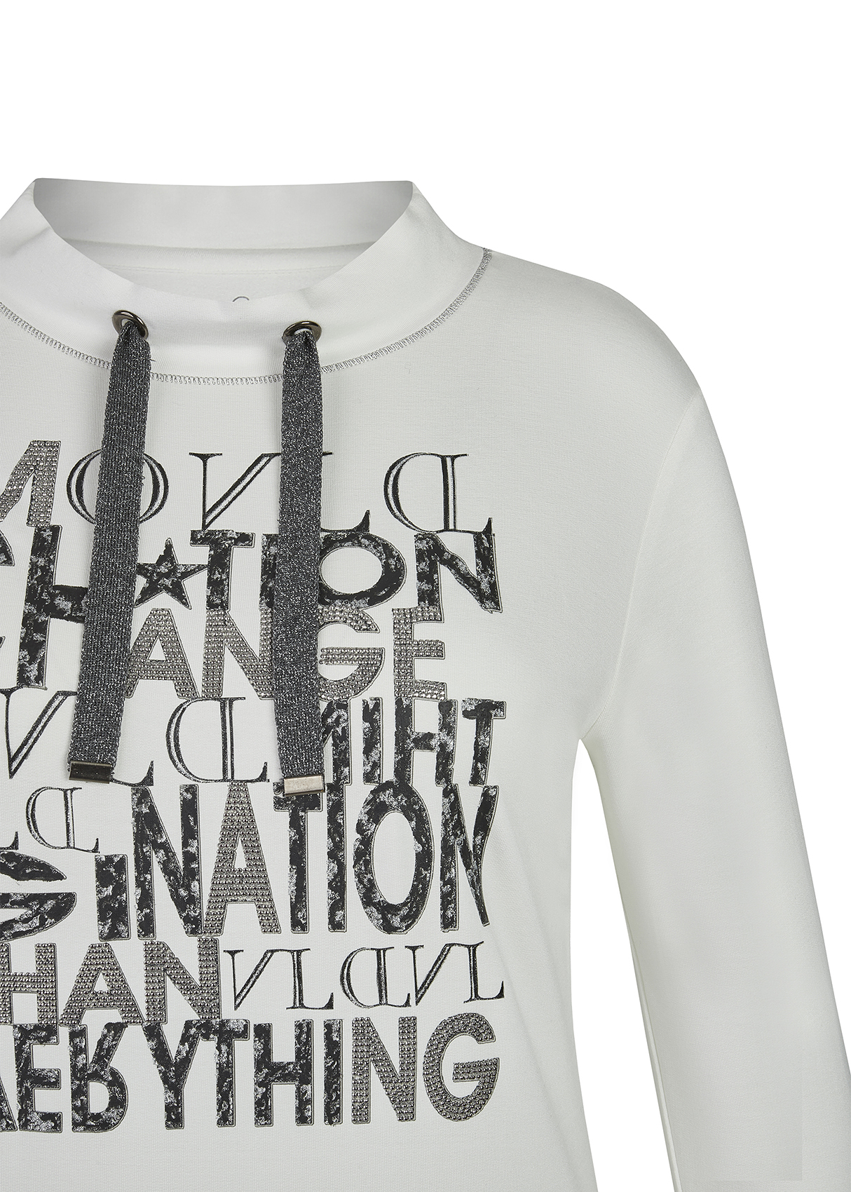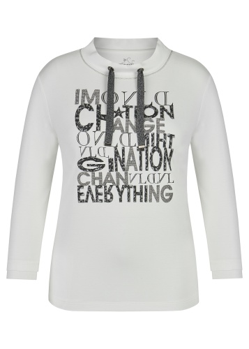 Футболка с длинными рукавами - отличный выбор для повседневного образа. Прямой крой, воротник на кулиске с нитью люрекса. Принт с надписью декорирован стразами. Приятный к телу эластичный материал с вискозой и модалом обеспечивает комфорт.