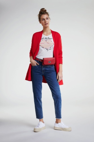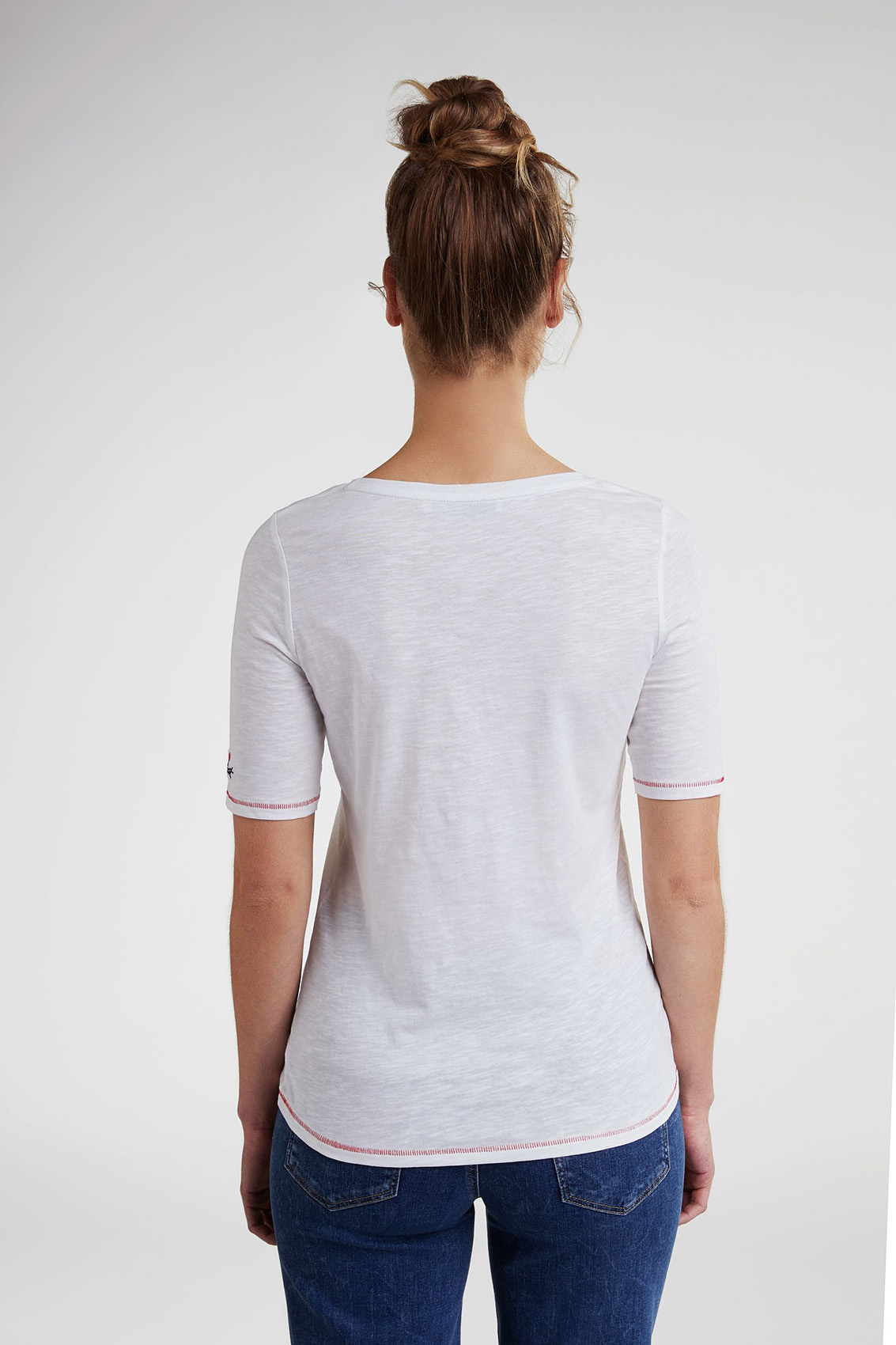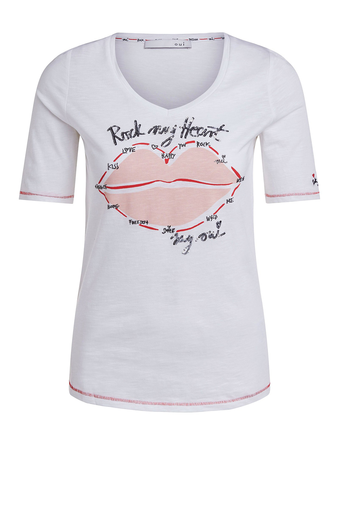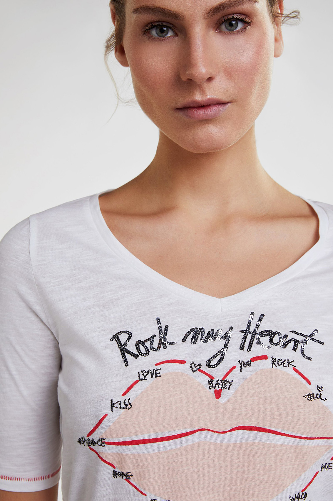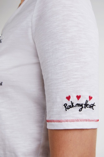 Футболка слегка приталенного силуэта. V-образный вырез горловины, рукава 1/2. Контрастная отстрочка на рукавах и по низу изделия. Принт на груди. Вышивка пайетками придает гламурный блеск. Хлопковый материал приятен к телу и обеспечивает комфорт. Эта футболка - замечательная основа для демократичного образа.