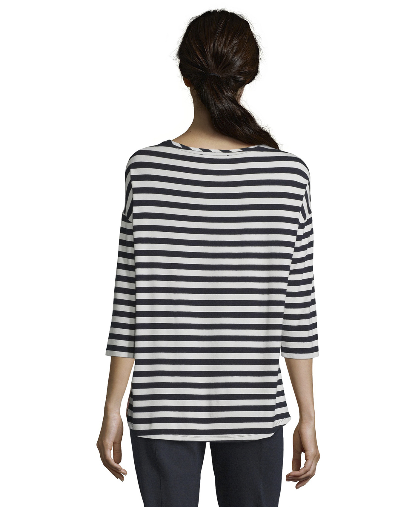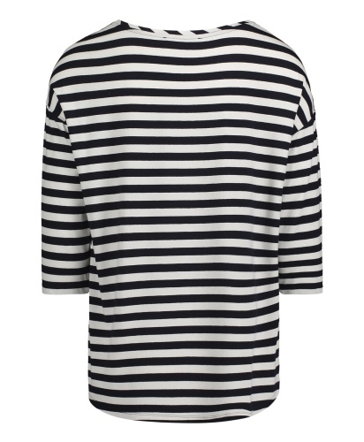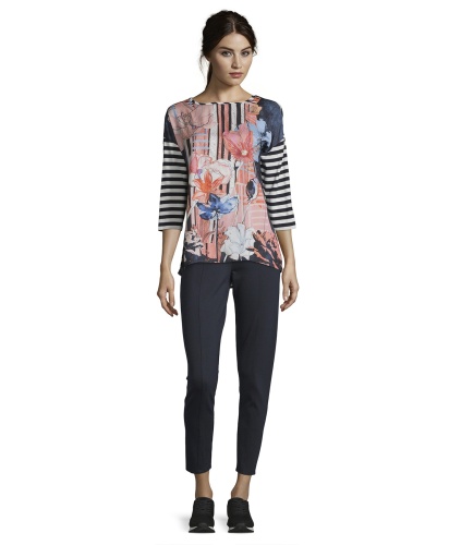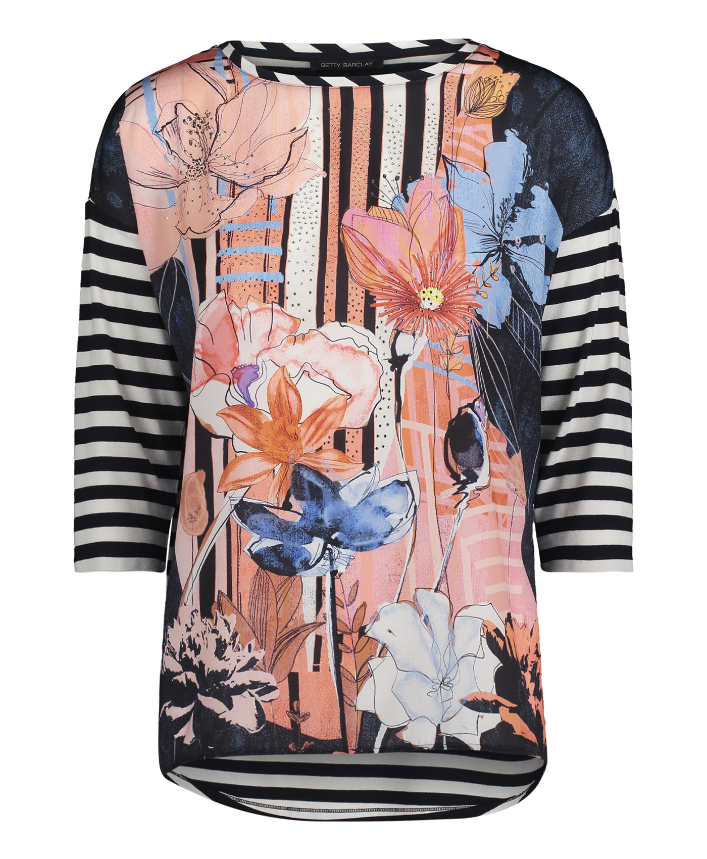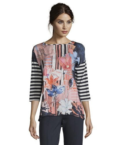 Стильный микс трендов - полоска и цветочный принт. Свободная посадка футболки и рукава 3/4 со спущенным плечом создают непринужденный образ. Стразы на груди придают блеск и гламур. Приятный к телу материал из вискозной смеси обеспечивает комфорт. Эта футболка - отличный выбор для модного образа на каждый день!