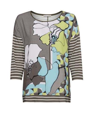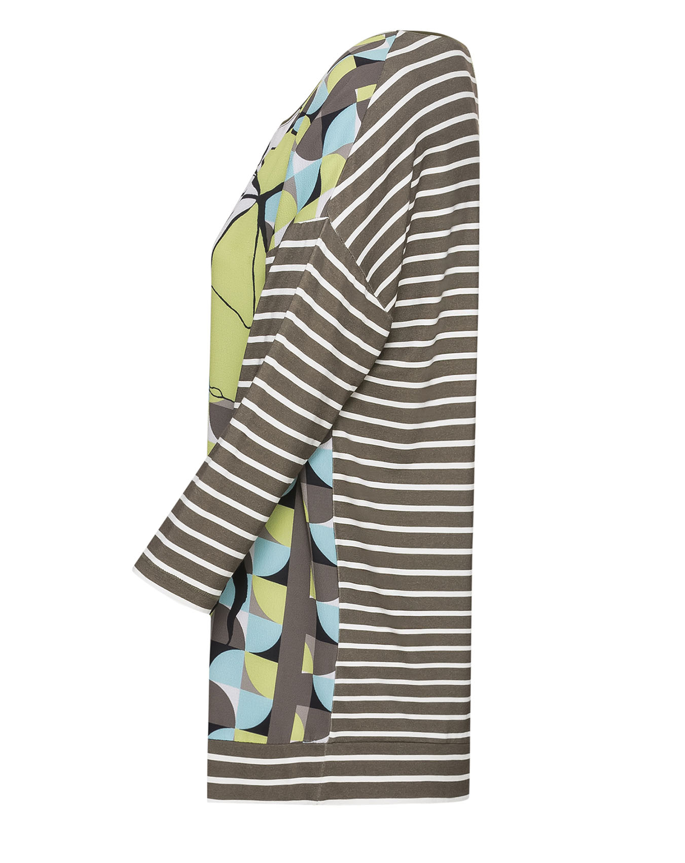 В неповторимом дизайне футболки гармонично сочетаются различные принты. Принт на передней части изделия выполнен из легкой вискозы, а рукава и спинка - из полосатого эластичного трикотажа. Удлиненные рукава со спущенным плечом и вырез "лодочка" идеально дополняют образ. • мягкая вискоза с трикотажем • сочетание трендовых принтов • рукав 3/4, спущенное плечо, горловина "лодочка", свободный покрой • длина около 66 см