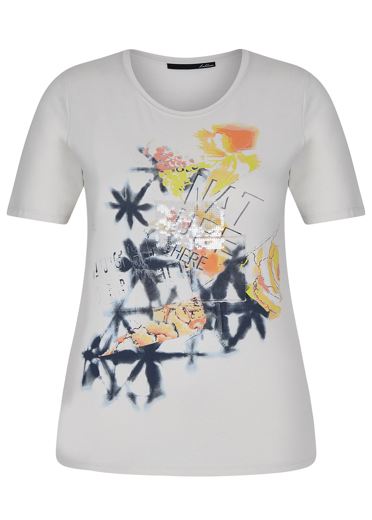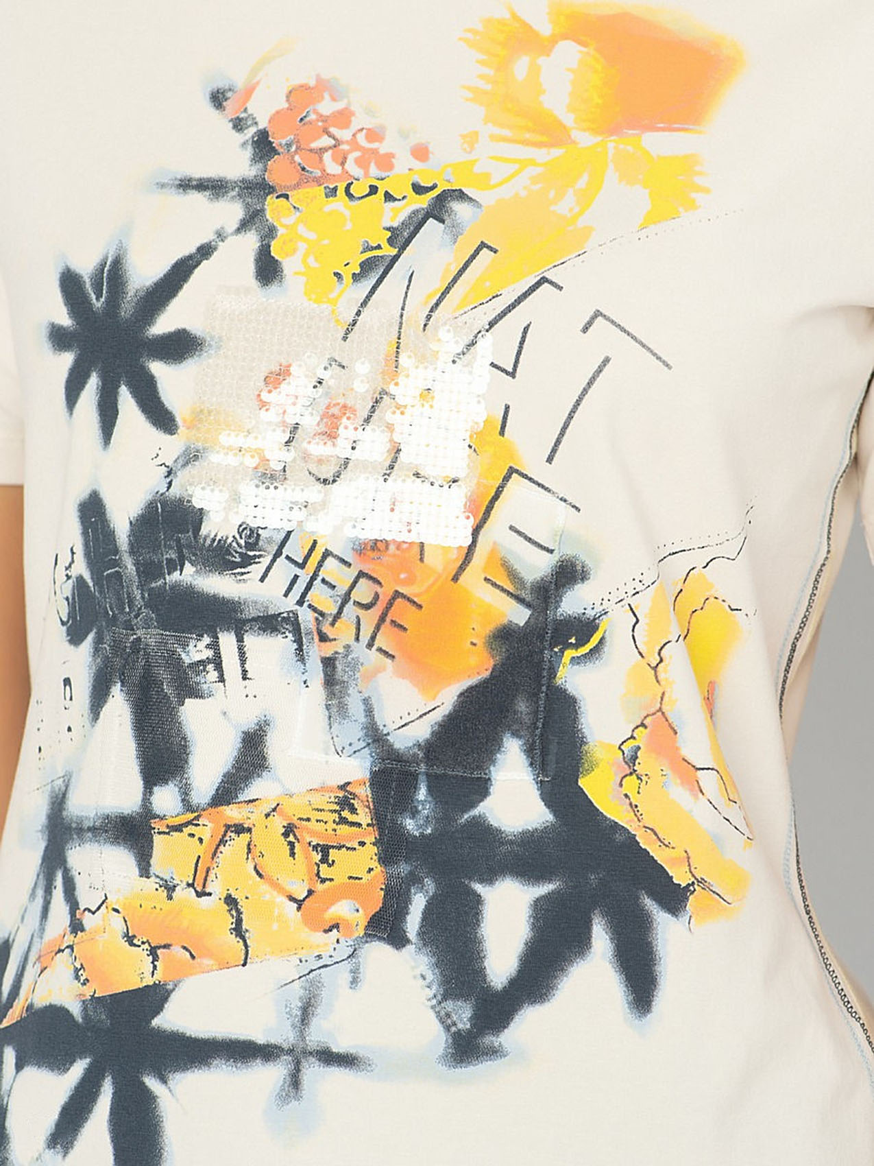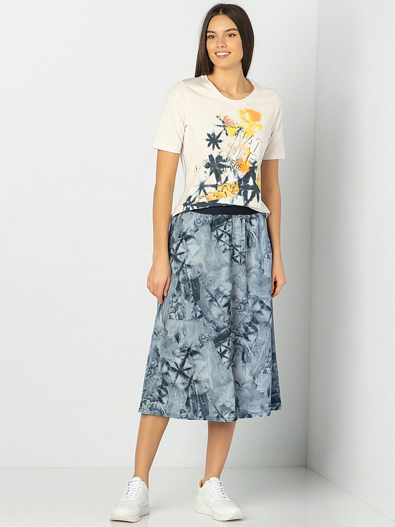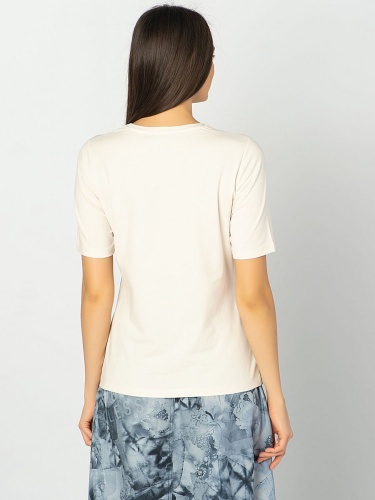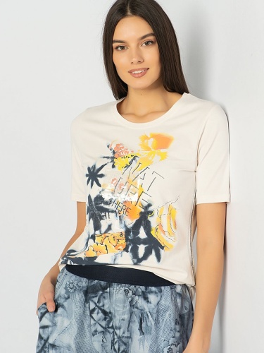 Футболка слегка приталенного силуэта. Трендовый принт с эффектом батика, пайетки. Приятный к телу материал из смеси хлопка и эластана. Длина изделия по спинке: 65 см.