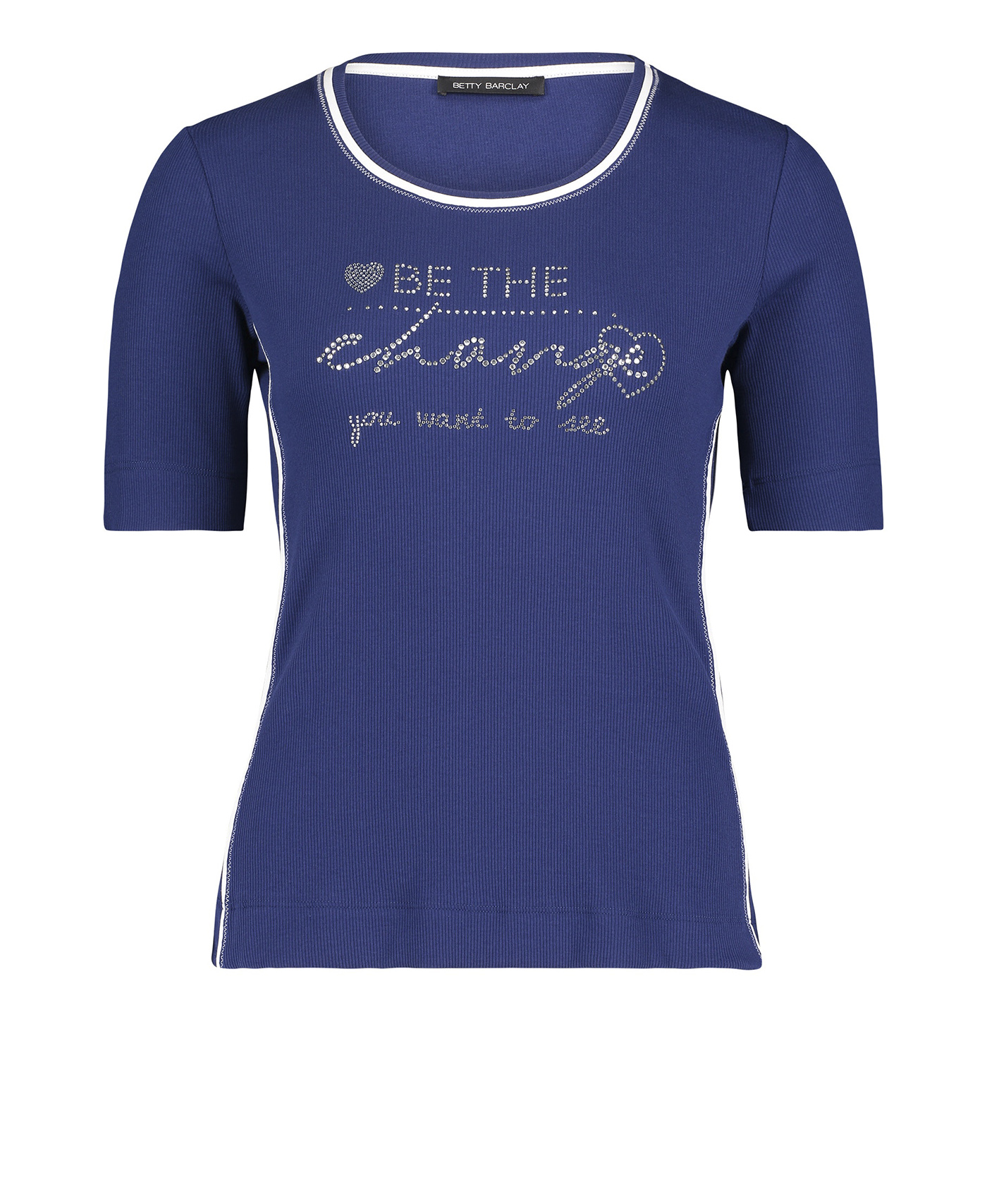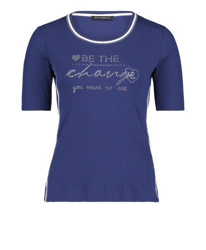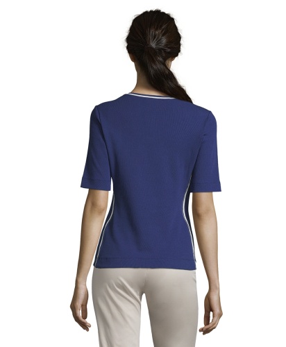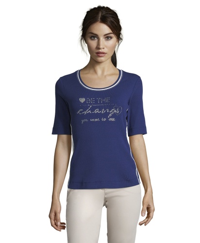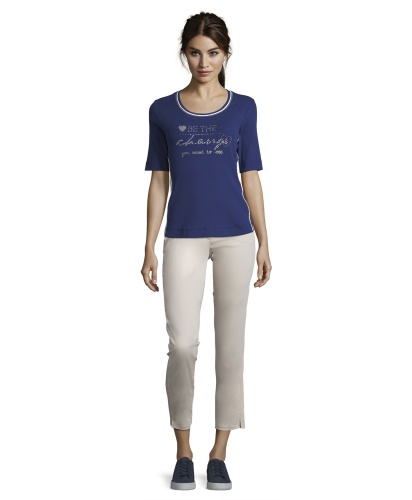 Футболка слегка приталенного силуэта. Круглый вырез горловины, рукава 1/2. Материал из хлопковой смеси приятен к телу и обеспечивает комфорт. Полосы тесьмы вдоль боковых швов и по вырезу горловины придают элементы спортивного стиля. Надпись из страз привносит в образ нотку гламура. Эта футболка - отличный вариант верха в стиле кэжуал!