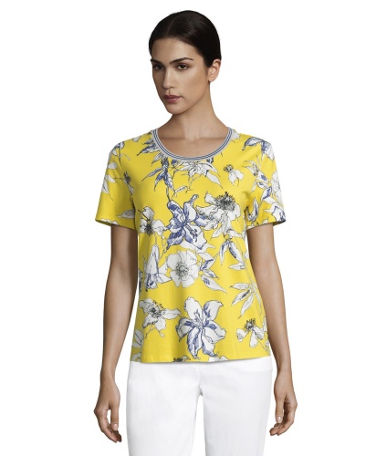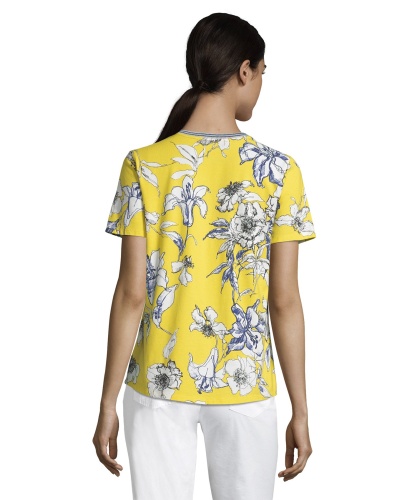 Цветочный принт - хит теплого сезона! Футболка прямого покроя. Круглый вырез горловины с обтачкой, короткие рукава. Материал из вискозной смеси приятен к телу и обеспечивает комфорт. Эта женственная модель прекрасно смотрится как с брюками, так и с юбкой.
