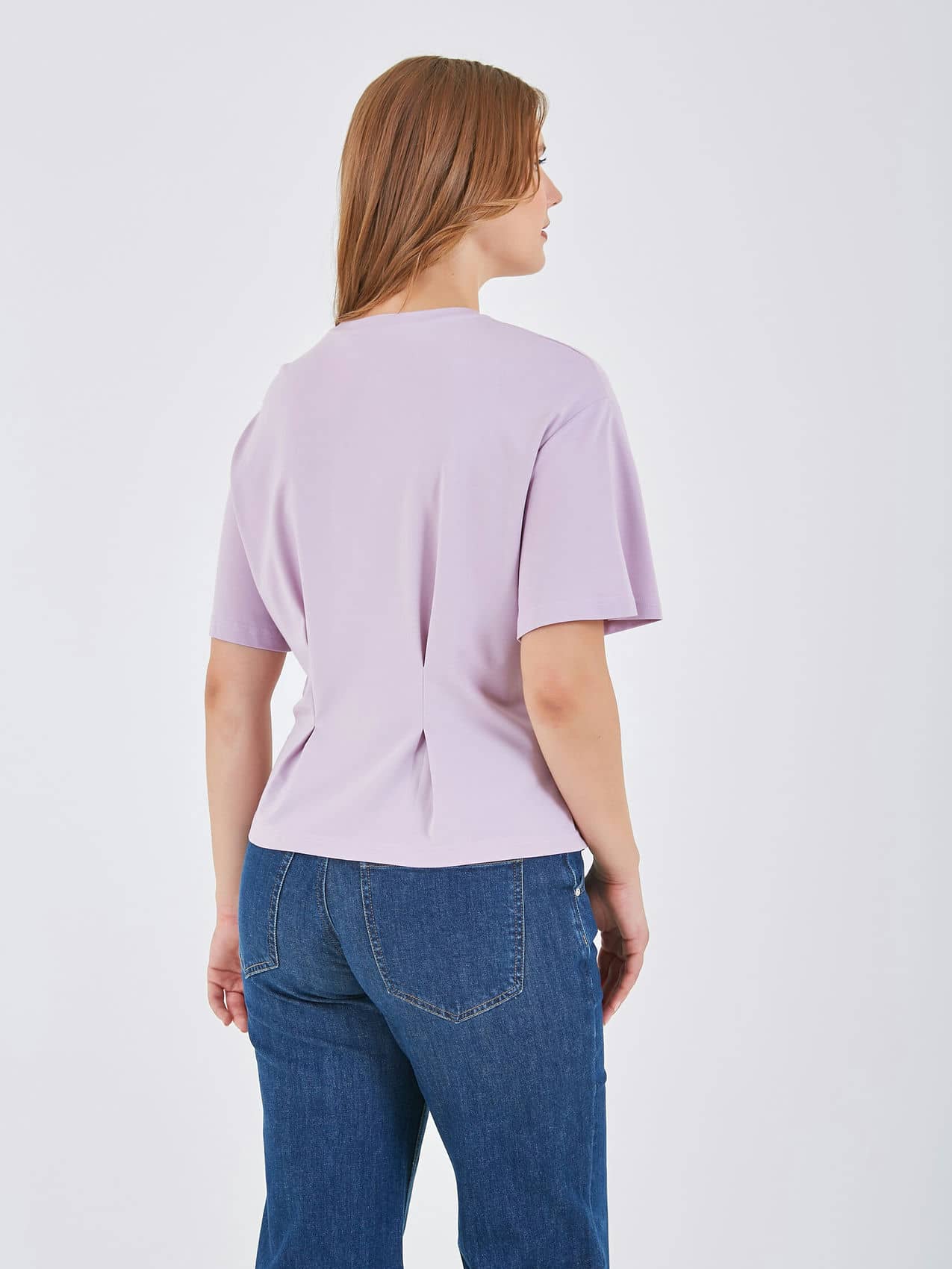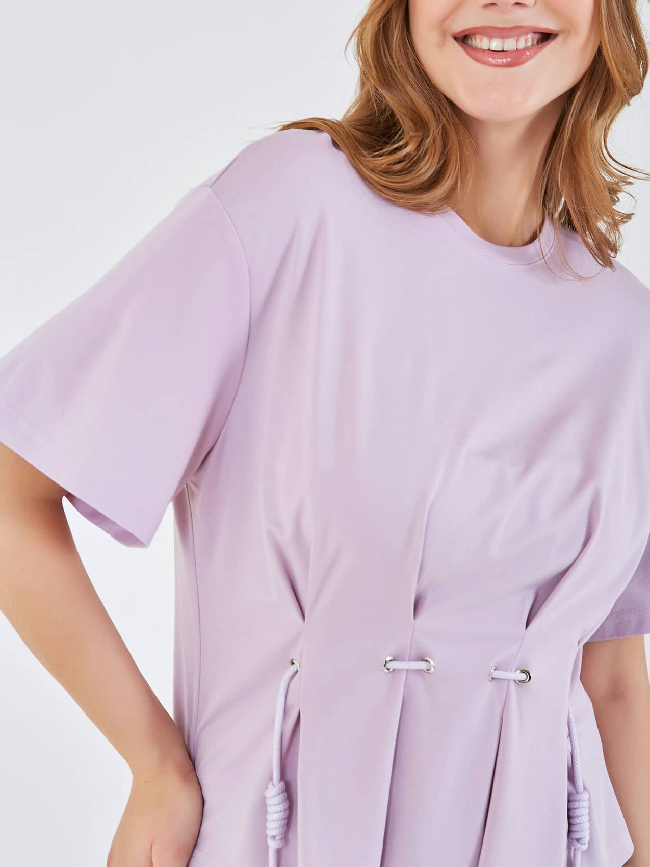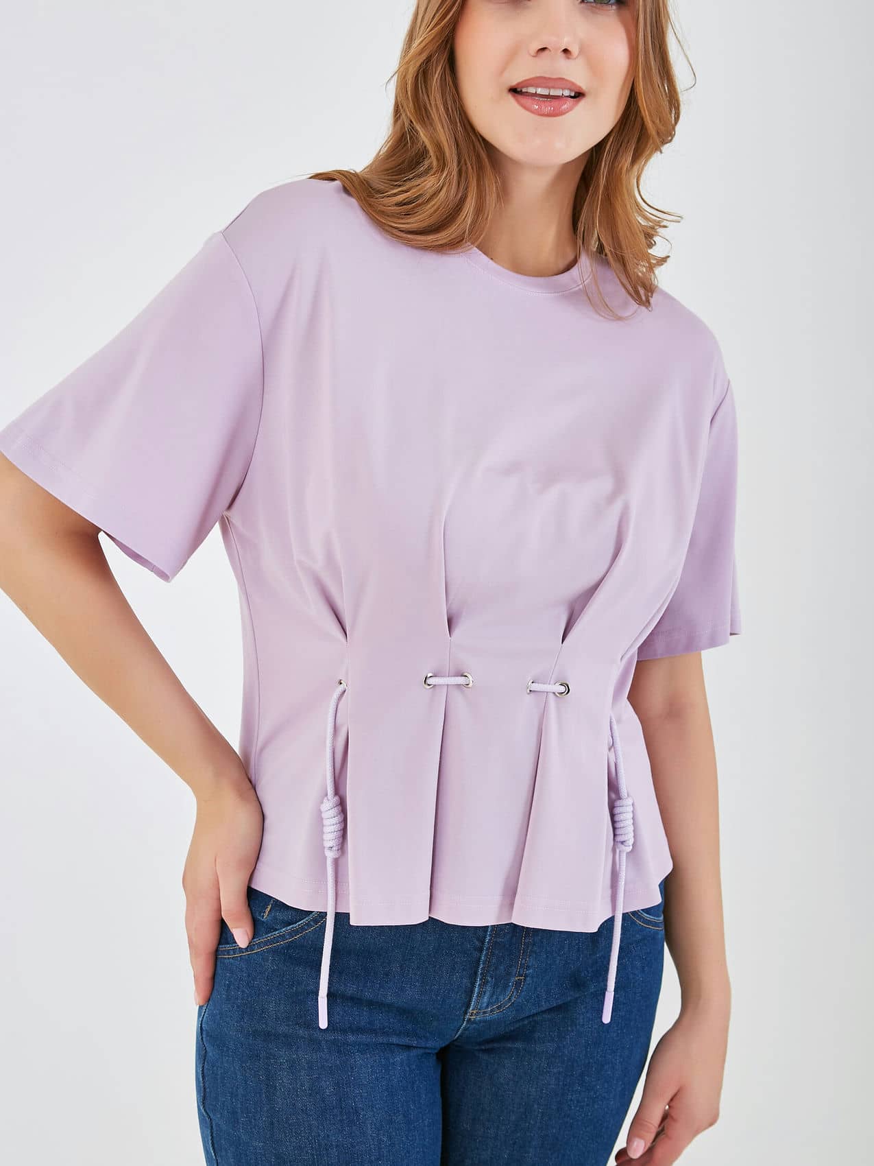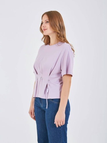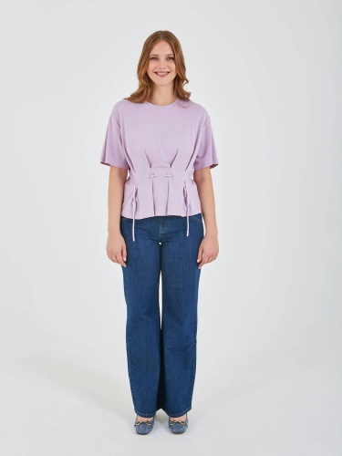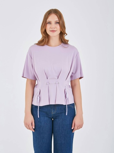 Приталенная футболка с декоративными шнурками и зажимами добавляющими оригинальности. Коллекция Весна-Лето 2025. Капсула "Самарканд". Параметры модели: 95-64-101, рост 175, размер 44-46