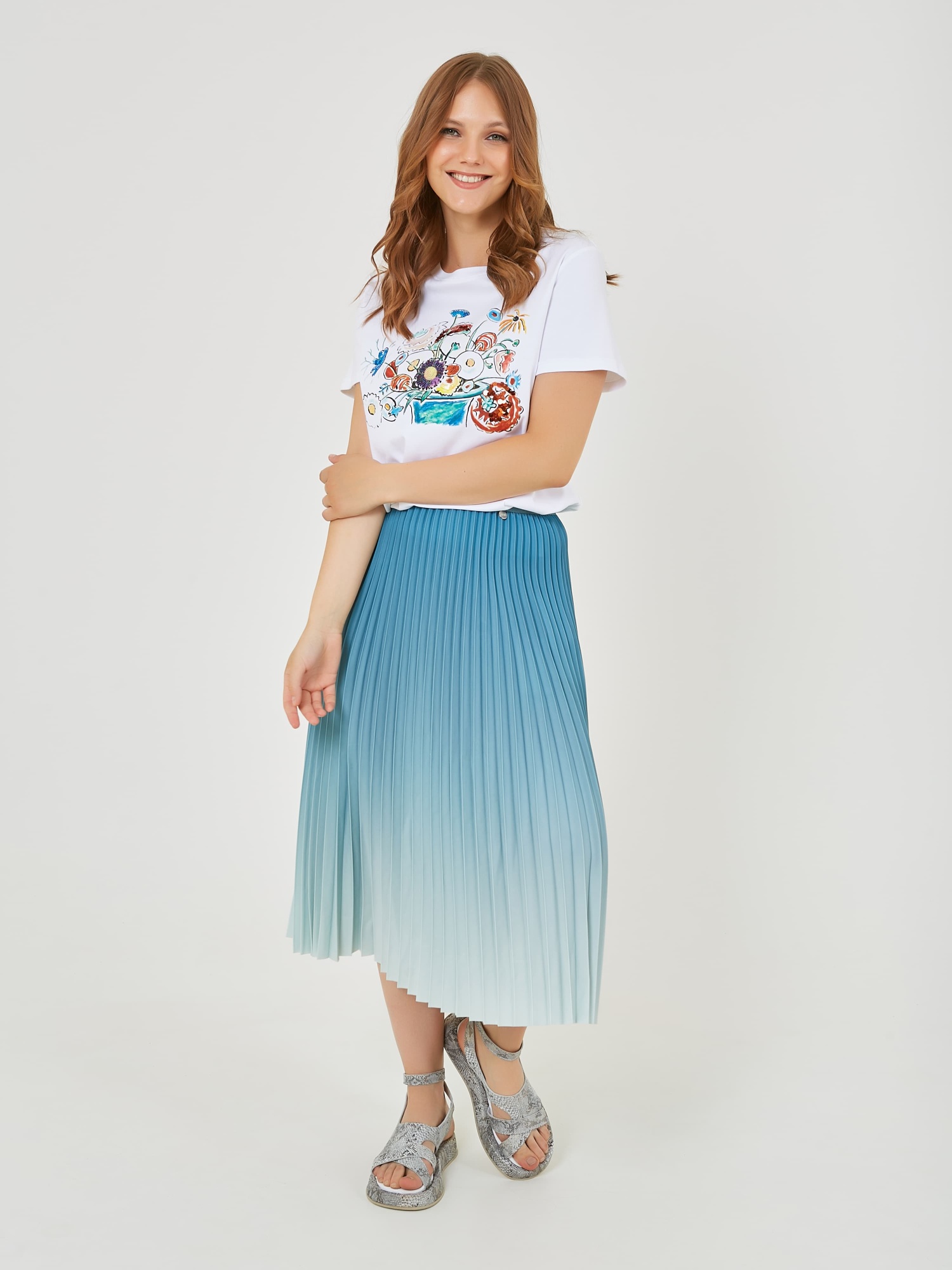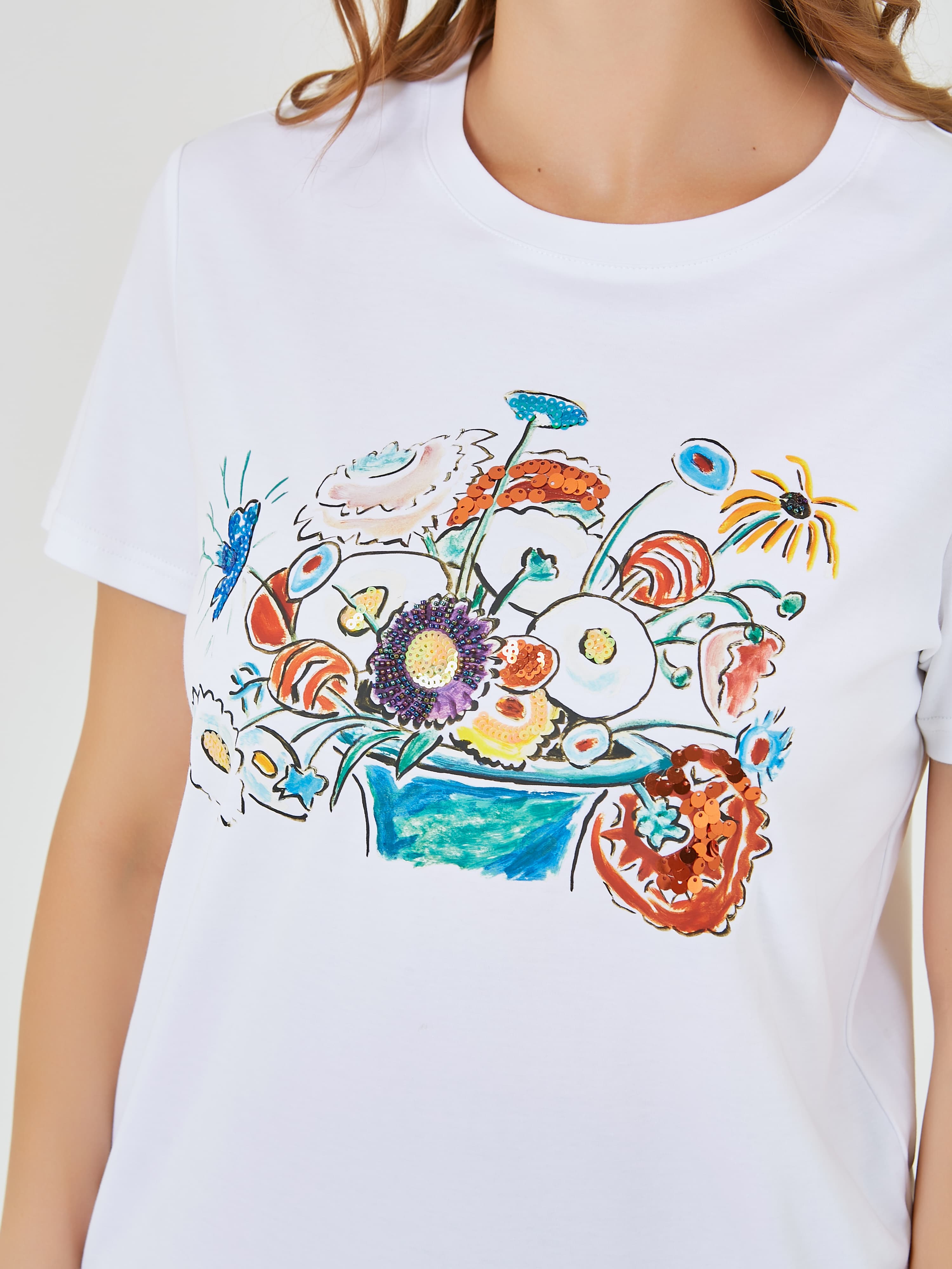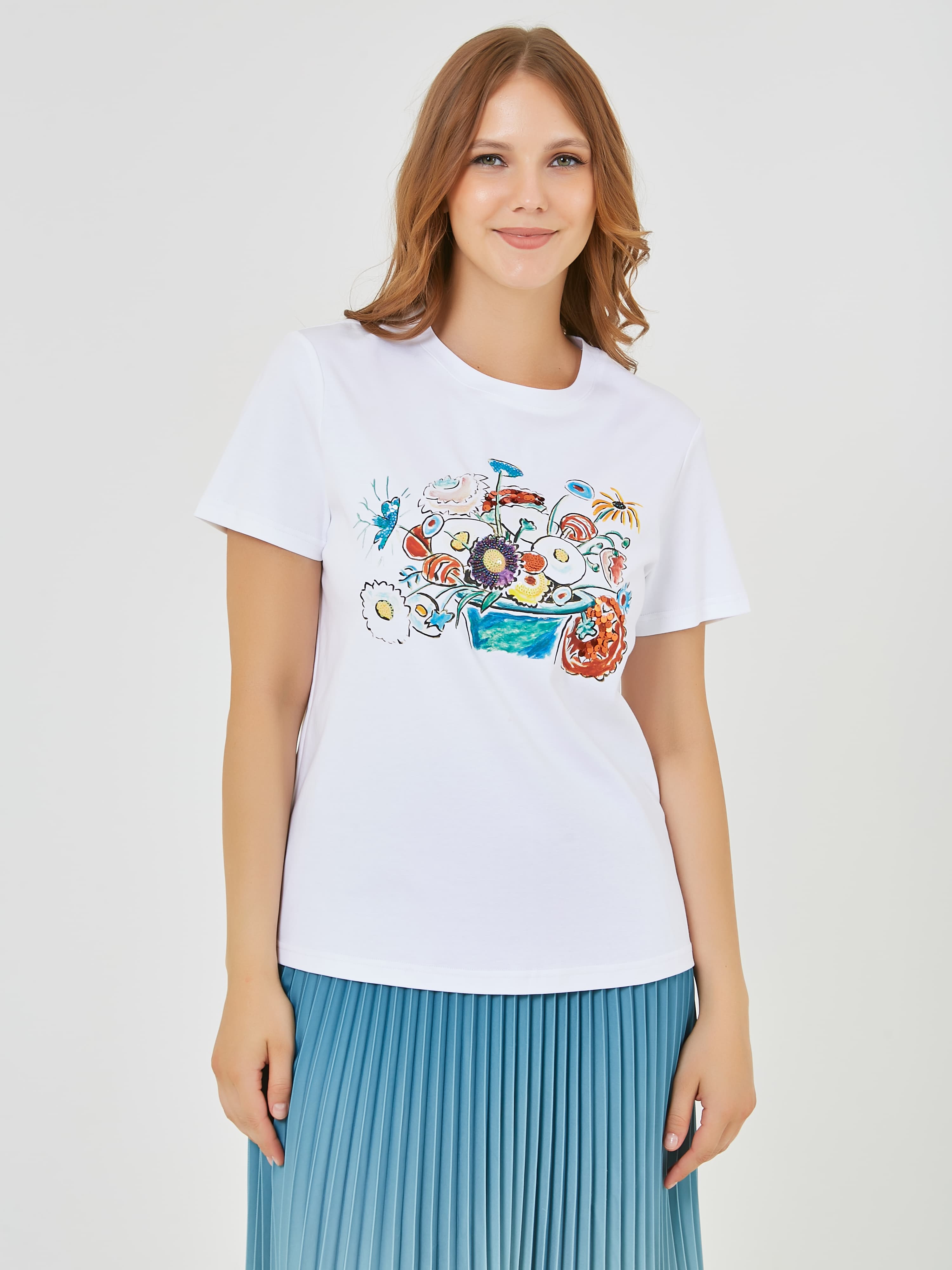 Футболка белого цвета с ярким цветочным принтом, изображающим букет различных цветов, выполнена из мягкого и комфортного материала. Она отлично подойдет для создания лёгкого и стильного повседневного образа. Коллекция Весна-Лето 2025. Капсула "Санторини". Параметры модели: 95-64-101, рост 175, размер 44-46
