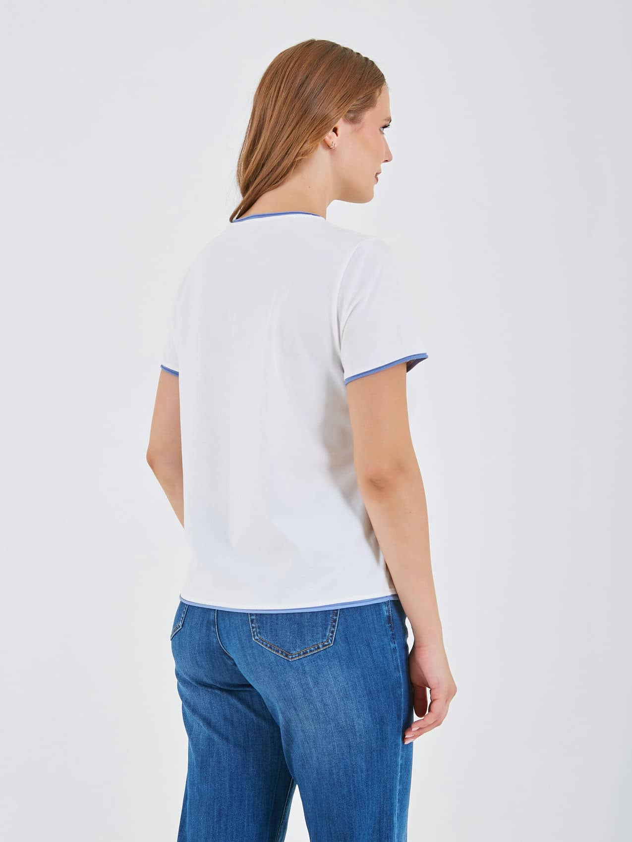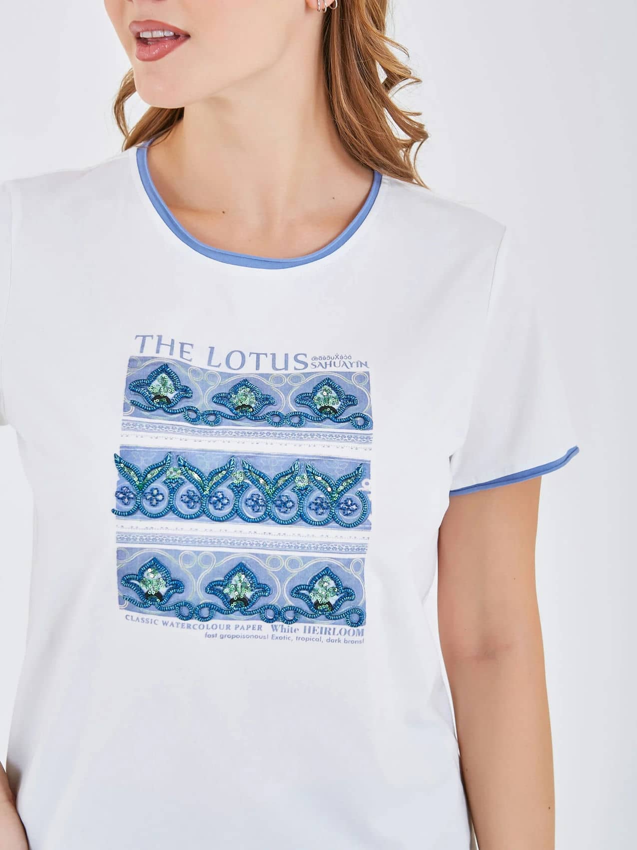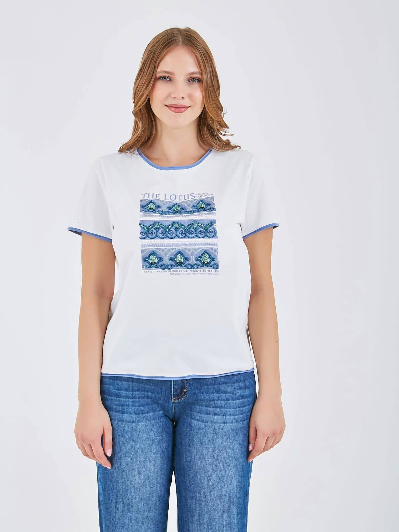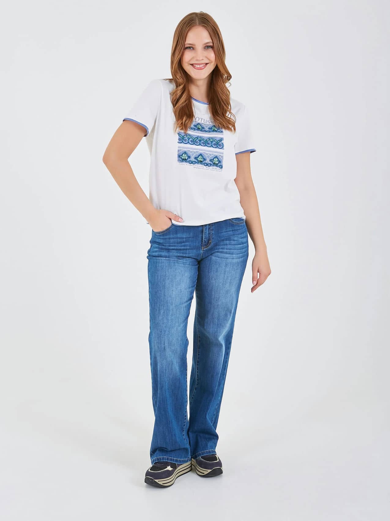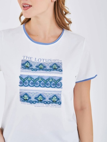 Футболка белого цвета с ярким принтом, на котором изображены узоры в сине-зеленых тонах. Нежный голубой кант по горловине и рукавам добавляет изящество, делая модель подходящей для свободного и стильного образа. Коллекция Весна-Лето 2025. Капсула "Самарканд". Параметры модели: 95-64-101, рост 175, размер 44-46