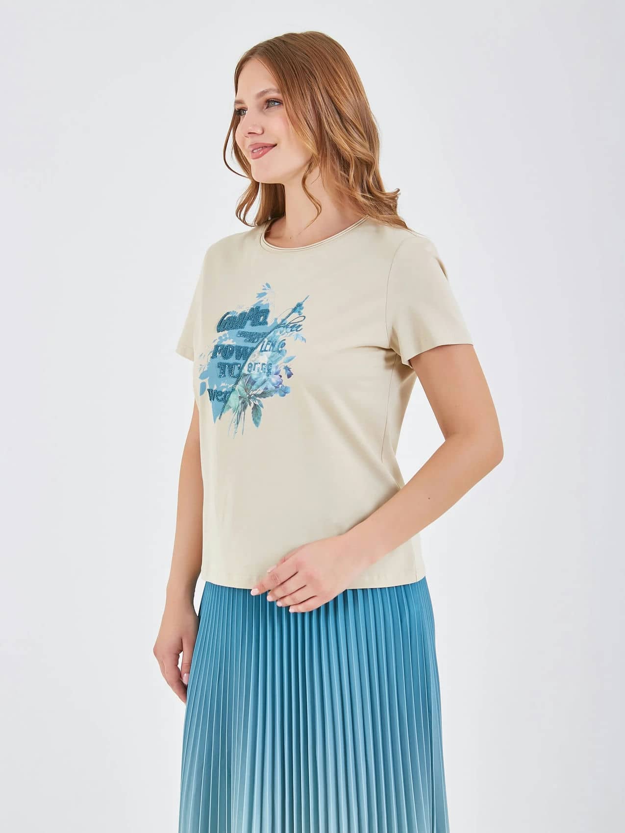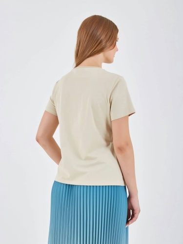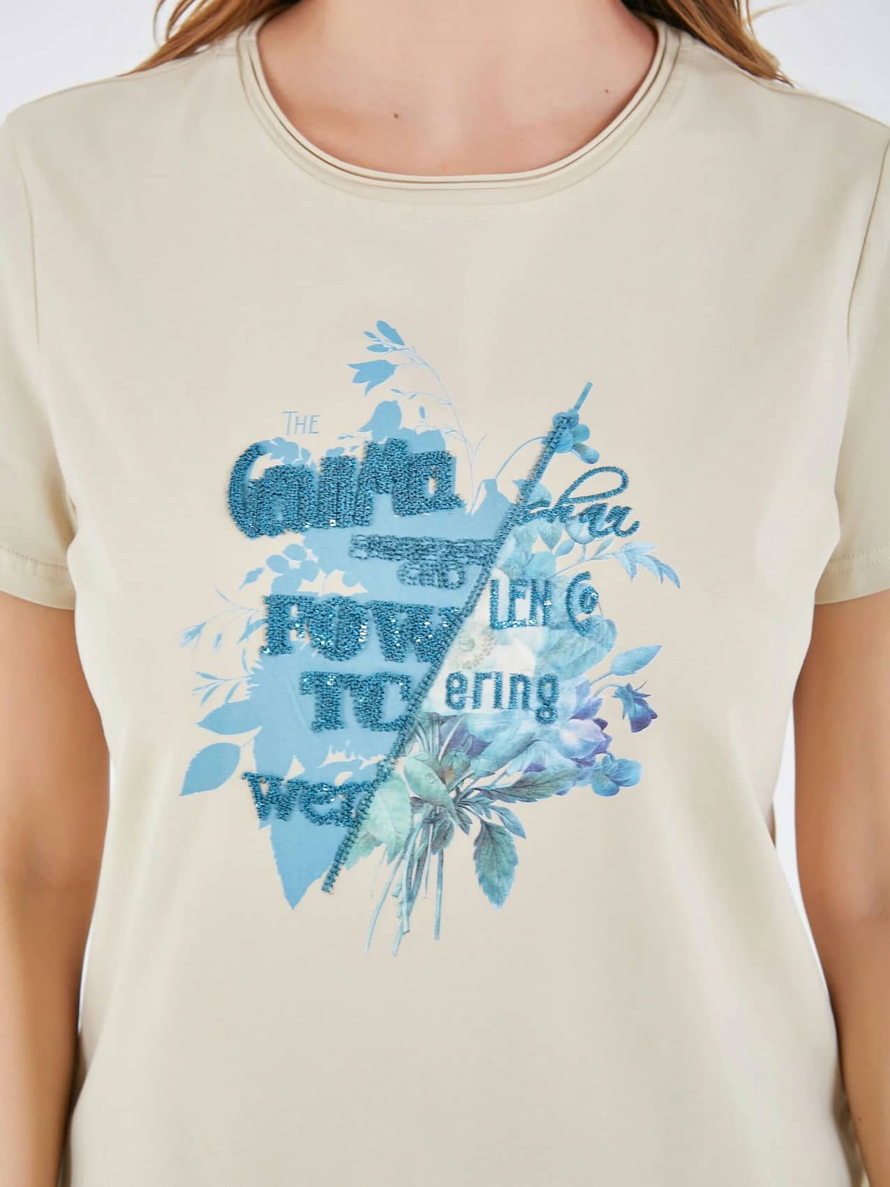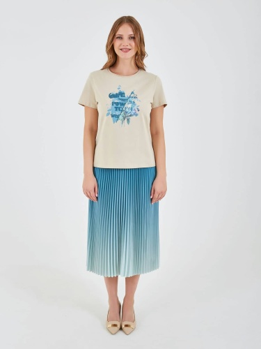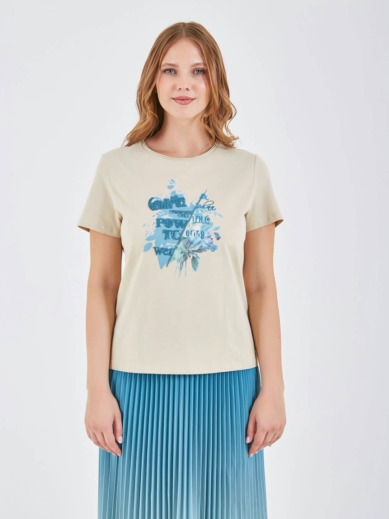 Футболка светлого бежевого цвета с декоративным принтом, на котором изображены цветы и листья в ярких голубых оттенках. Ненавязчивый текст на принте и округлый воротник придают изделию стильный и женственный вид, идеально подходящий для повседневной носки. Коллекция Весна-Лето 2025. Капсула "Марракеш". Параметры модели: 95-64-101, рост 175, размер 44-46