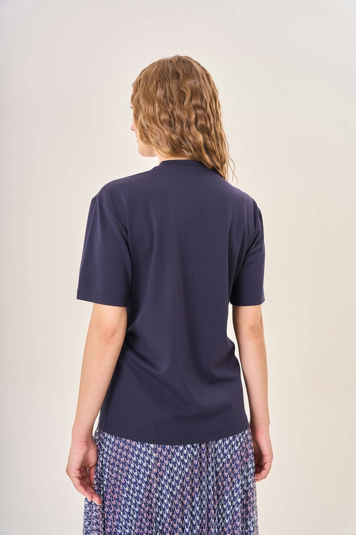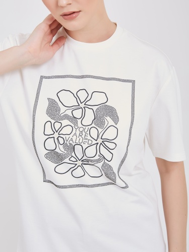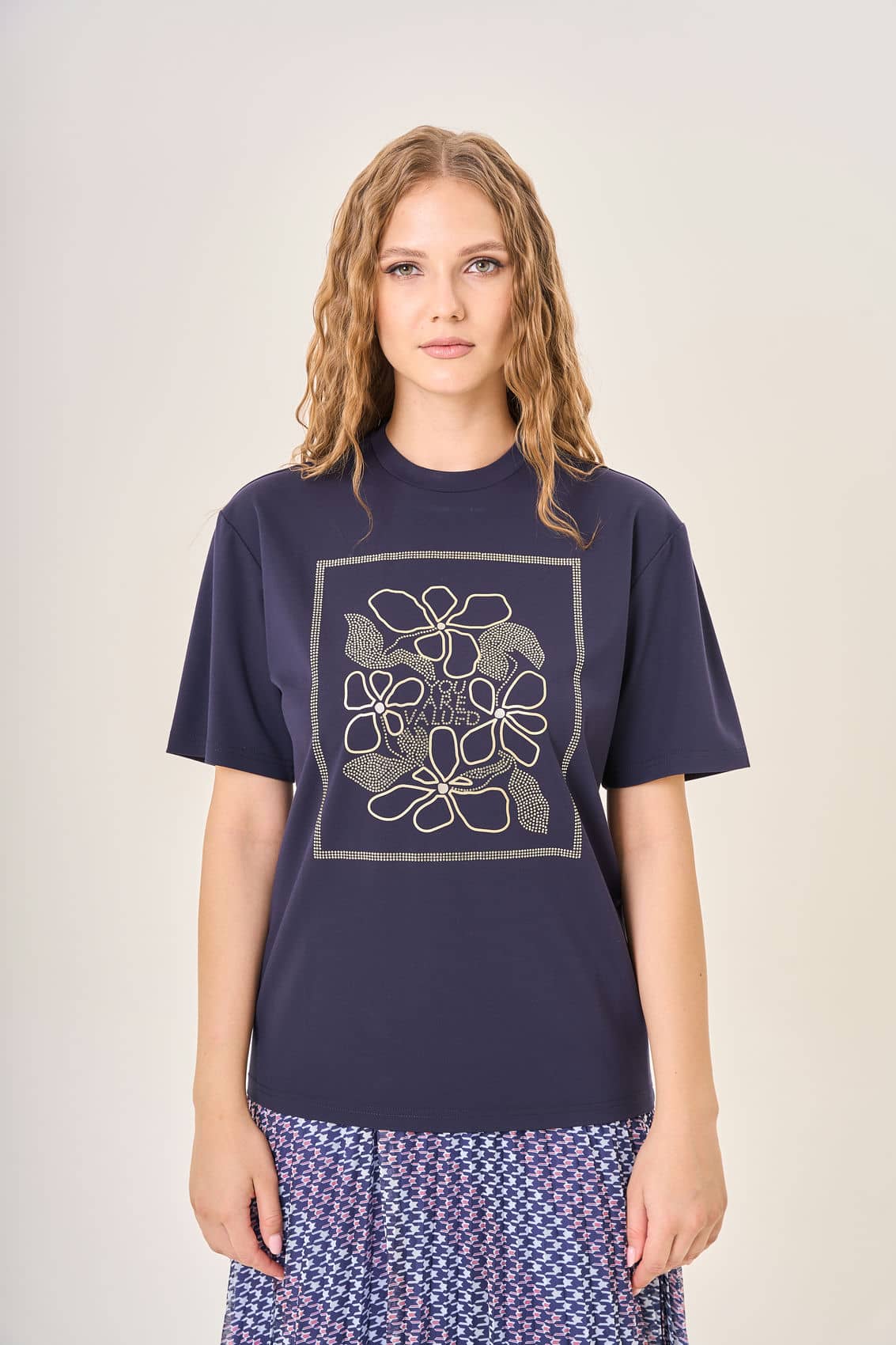 Футболка обладает классическим втачным рукавом и выполнена из более плотного трикотажа, чем летние варианты. Благородный чернильно-чёрный оттенок выгодно подчёркивает оригинальную аппликацию из золотых страз, придавая изделию дороговизну и шик. Футболка подойдёт женщинам разных фигур, идеально вписываясь в городской стиль и позволяя создать стильный и утончённый образ.