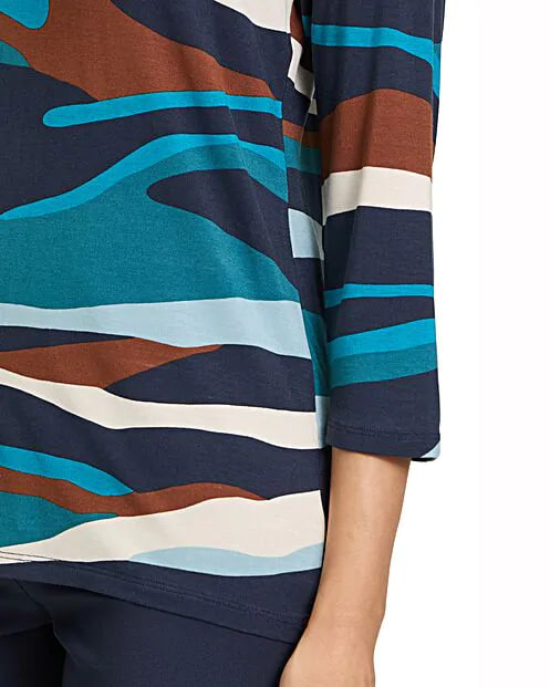 Кофта сочетает в себе яркий стиль и максимальный комфорт. Её рукава три четверти добавляют лёгкости и современности, а абстрактный узор из темно-синих, бирюзовых, коричневых и белых волнистых полос создаёт неповторимый визуальный эффект. Такая модель станет прекрасным дополнением вашего гардероба, позволяя создавать интересные и оригинальные образы, которые обязательно обратят на вас внимание и подчеркнут вашу индивидуальность.