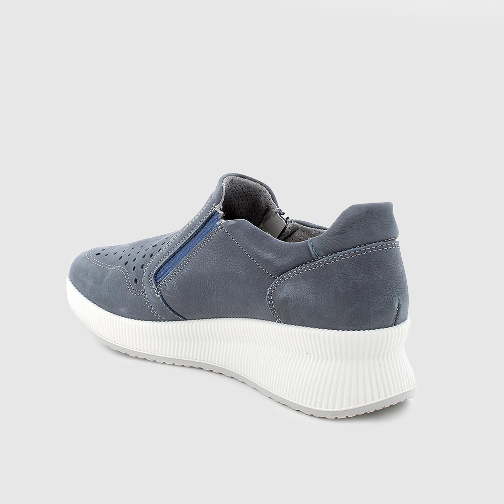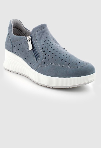 Современная обувь из мягкой перфорированной натуральной кожи и текстильной подкладки. Ширина модели регулируется благодаря боковой молнии и эластичной резинки.