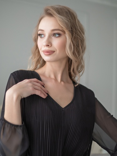 Плиссированное платье-трапеция, украшенное кружевом по низу изделия, идеально сгладит любые недостатки фигуры и подчеркнет достоинства. V-образный вырез, рукав епископа, длина платья – до середины колена.