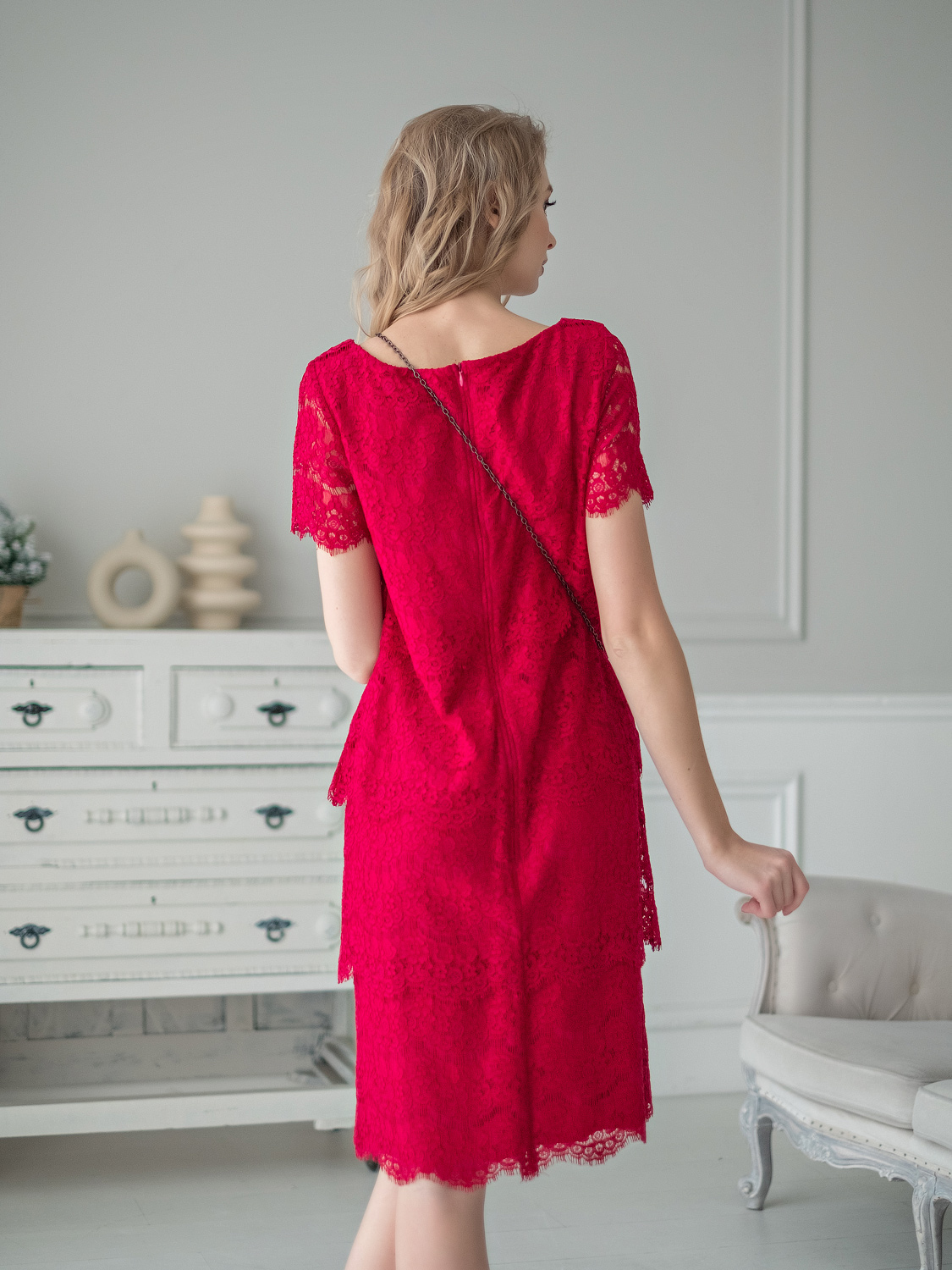 Ярко красное платье из кружева прямого кроя сгладит все недостатки фигуры и подчеркнет достоинства. Длина до середины колена, замок-молния на спинке платья, втачной рукав до середины плеча. Платье станет частью обворожительного вечернего образа.