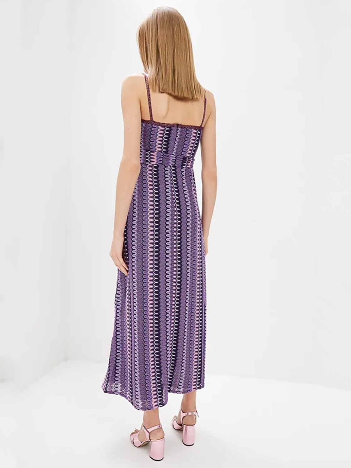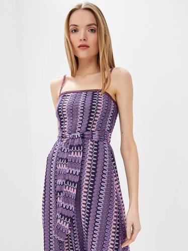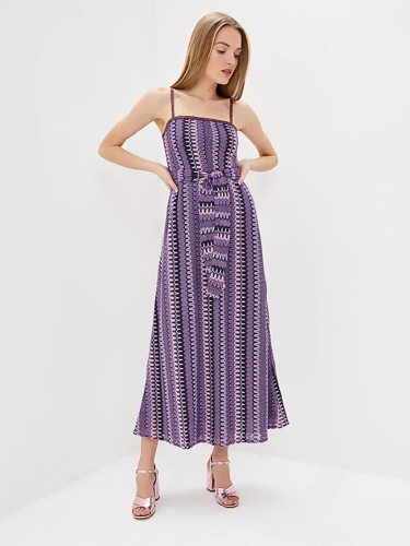 Сарафан длины макси на узких бретелях. Насыщенный оттенок и геометрический узор придают притягательность образу. В комплекте идет пояс из основного материала изделия.