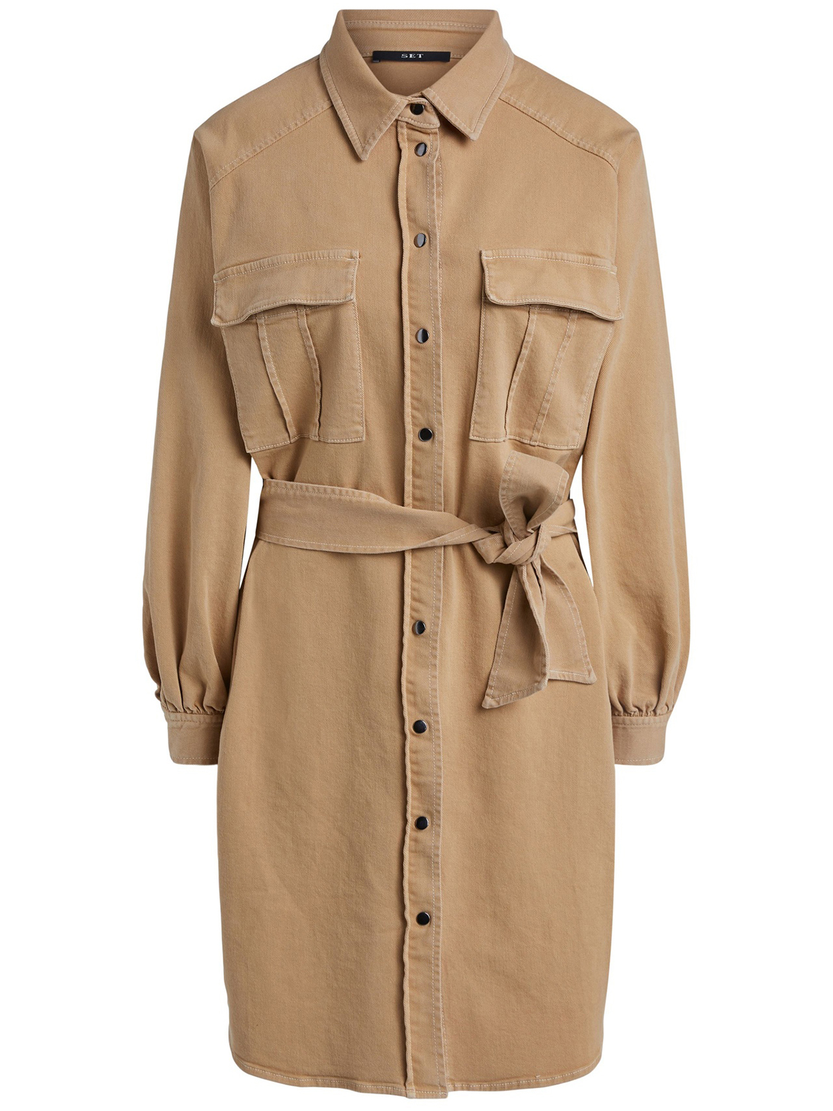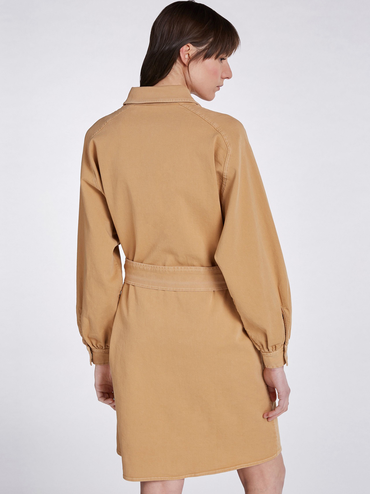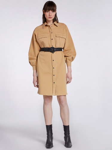 Песочное платье-рубашка из саржевого хлопка. Отложной рубашечный воротник, платка с контрастными пуговицами. Длинный втачной рукав с широкими манжетами. Объемныме накладные карманы на груди. Длина 42 размера: 98 см. Рост модели 178 см, ее размер - 42 (российский).