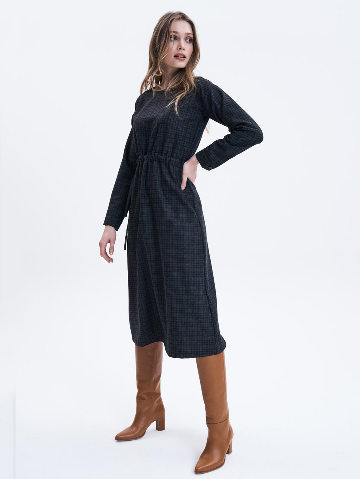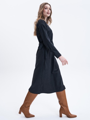 Платье длины миди для создания образа в деловом стиле. Кулиска на поясе, втачной рукав полной длины, овальный вырез горловины.