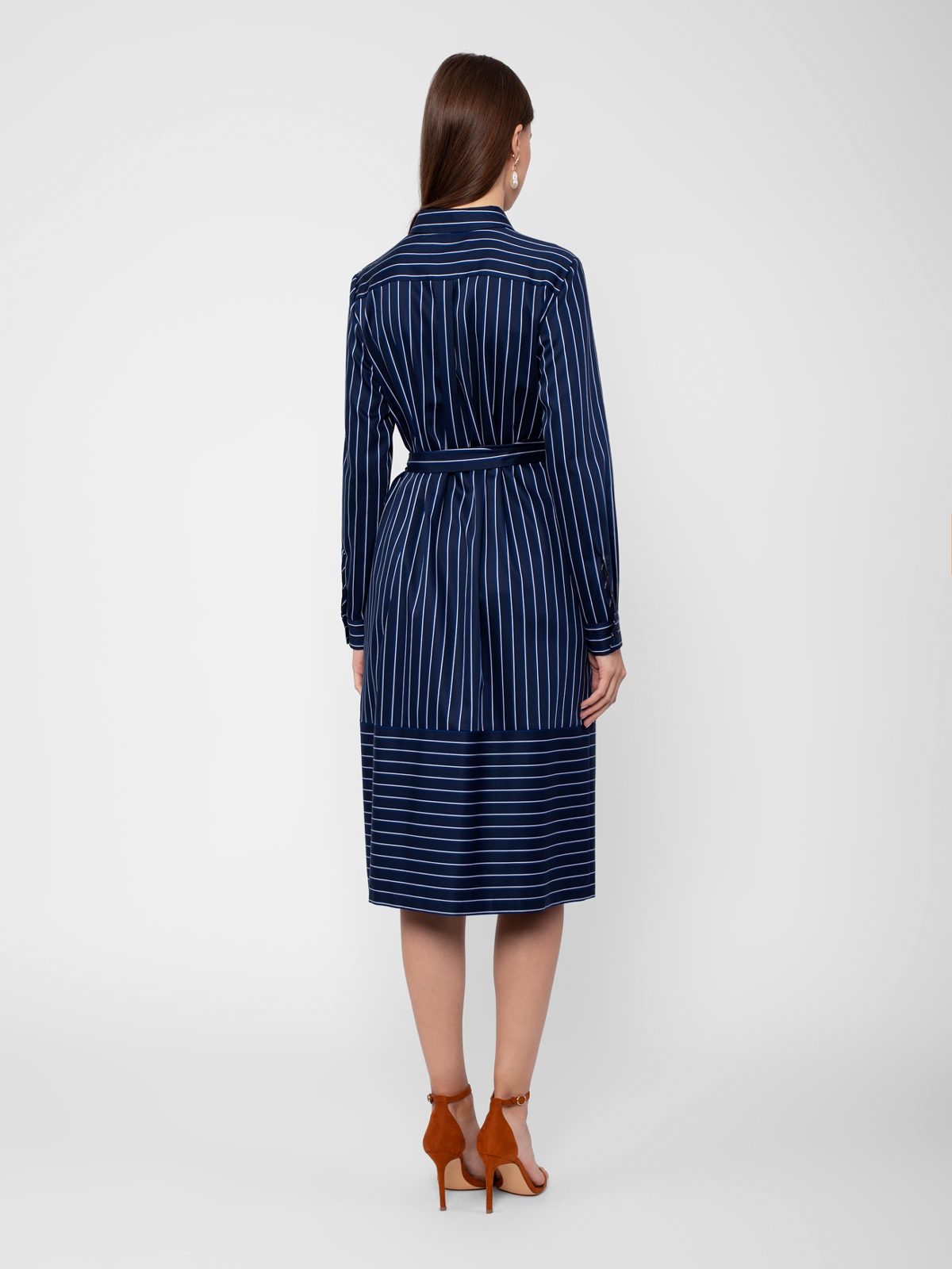 Платье в полоску длины миди прямого силуэта с классическим отложным воротником и втачным рукавом полной длины с манжетами. Спереди застежка на пуговицы и прямоугольные накладные карманы. На талии съемный пояс из основной ткани.