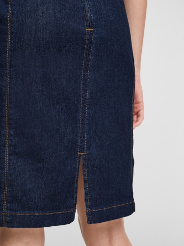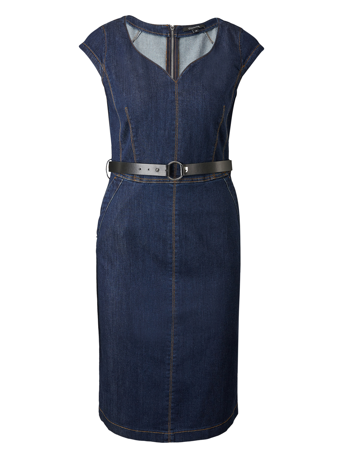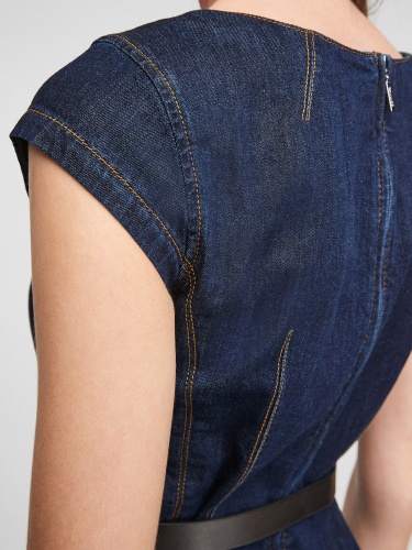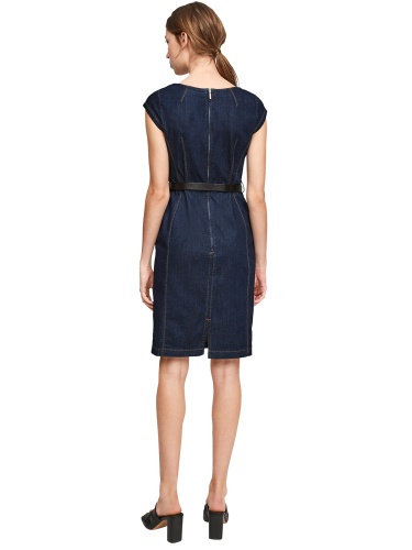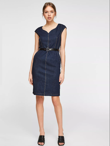 Однотонное латье длины до колена. Приталенный силуэт, в комплекте идет ремень из экокожи. Акцентная контрастная строчка, фигурный вырез горловины.