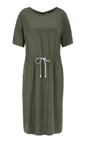 Платье миди прямого покроя. Круглый вырез горловины, короткие рукава со спущенным плечом. Кулиска на талии подчеркивает достоинства фигуры.