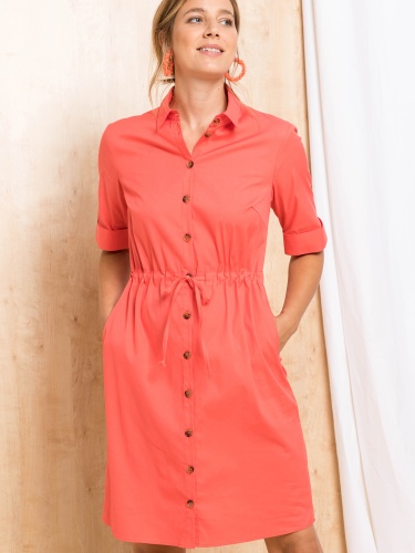 Однотонное платье в яркой расцветке идеально подходит для жаркой летней погоды. Кулиска на поясе позволяет сделать силуэт приталенным. Отложной рубашечный воротник, планка с контрастными пуговицами. Втачной рукав с подворотами.