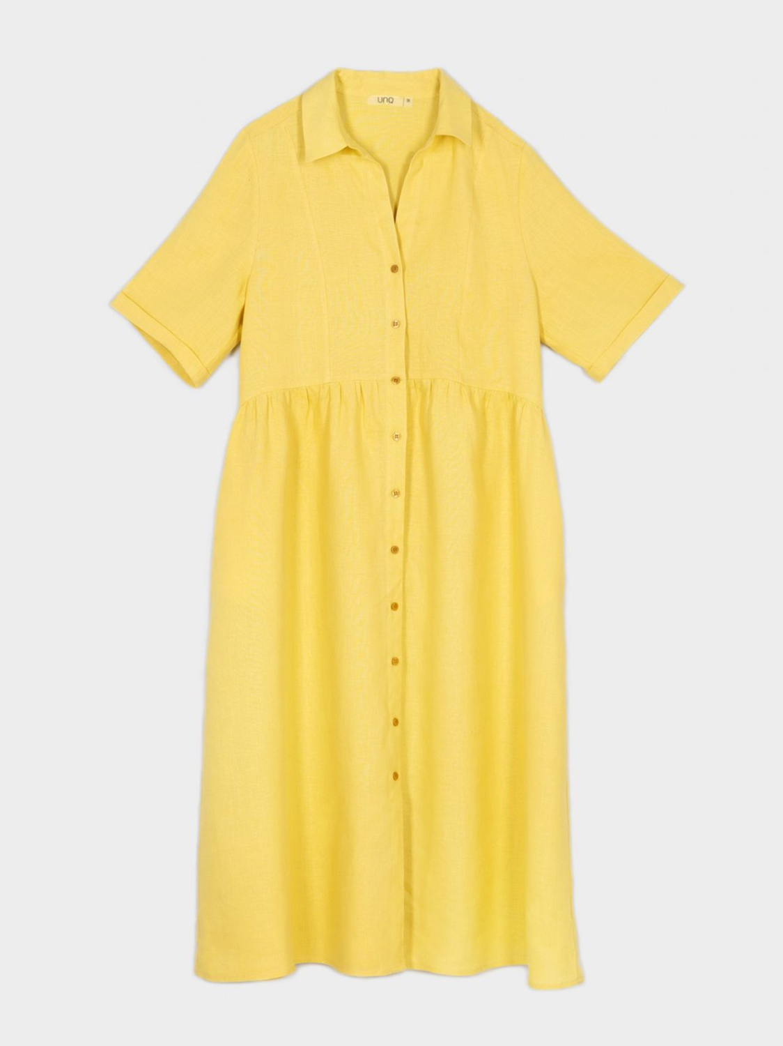 Хлопковое платье-рубашка свободного кроя. Длина миди. Отложной рубашечный воротник. Втачной рукав длиной до сгиба локтя. Застежка на пуговицы.