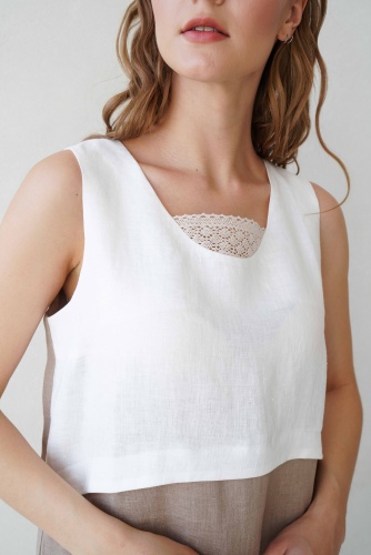 Льяное платье STERN ниже колена отлично подойдет для отдыха на жарких курортах. Модель украшена вязаным элементом на круглом вырезе и накладным фартуком.