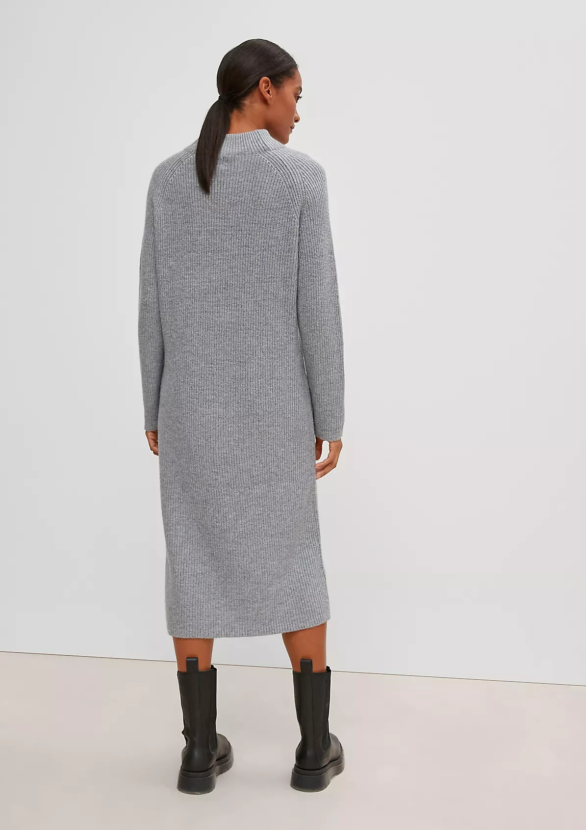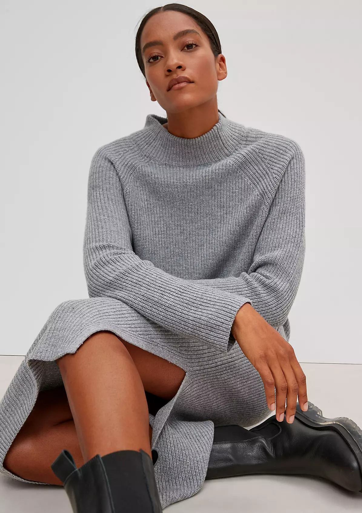 На сайте указаны российские размеры. Трикотажное платье из смесовой шерсти с кашемиром длины миди. Длинные рукава. Подол с разрезами по бокам. Длина для размера 42 около 113 см. Рост модели 177 см.