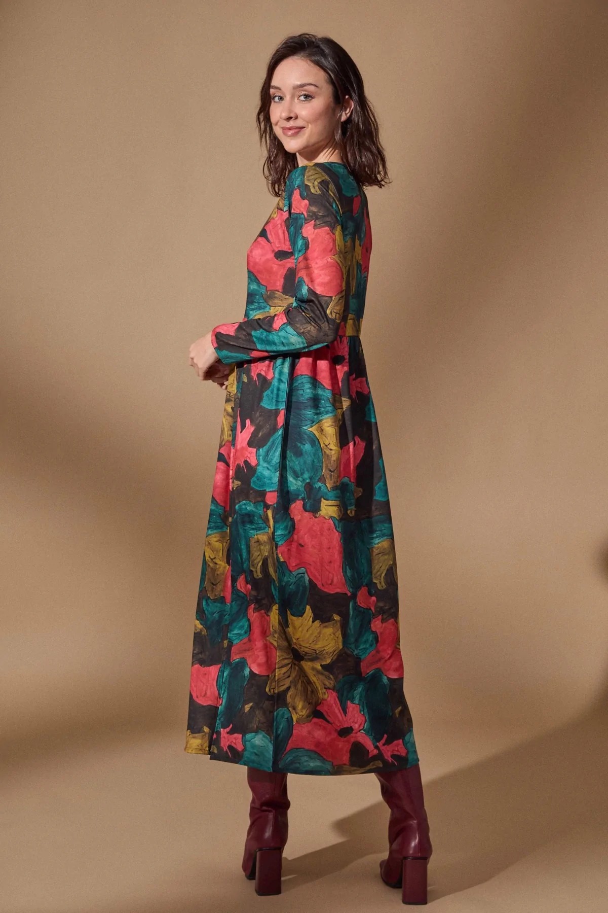 На сайте указаны российские размеры. Длинное платье с цветочным принтом и пышным и объемным низом. Ненавязчивый разрез спереди. Классические длинные рукава и широкий вырез воротника. Рост модели 170 см. Длина 124 см в размере 44.