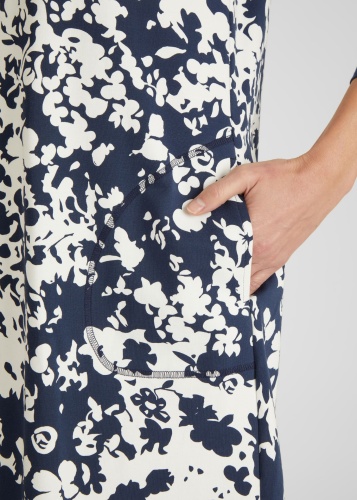 На сайте указаны российские размеры. Это платье прямой формы из хлопка сразу привлекает внимание своим абстрактным цветочным узором. Шнурок на воротнике и нашивные карманы придают платью спортивный вид. Рукава 3/4, накладные карманы, кулиска на воротнике. Рост модели 176 см. Длина по спинке от плеча для размера 46: 100 см.