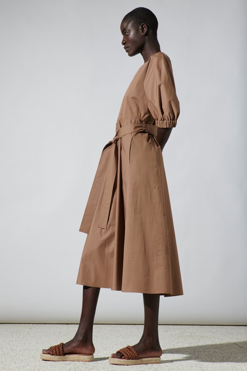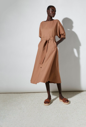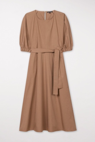На сайте указаны российские размеры. Платье средней длины из тонкой тканой габардиновой эластичной ткани со сдержанной посадкой и расклешенным силуэтом, круглым вырезом горловины с застежкой на пуговицы и короткими рукавами с эластичной застежкой. Женственность на талии подчеркивается завязывающимся поясом. Рост модели 178 см.