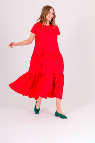 Платье А-силуэта длиной midi из легкого 100% хлопка с оборкой чуть ниже талии и по низу, в боковых швах располагаются два кармана. Укороченные цельнокроеные рукава. Круглый вырез горловины с разрезом по переду и встречной складкой по спинке.