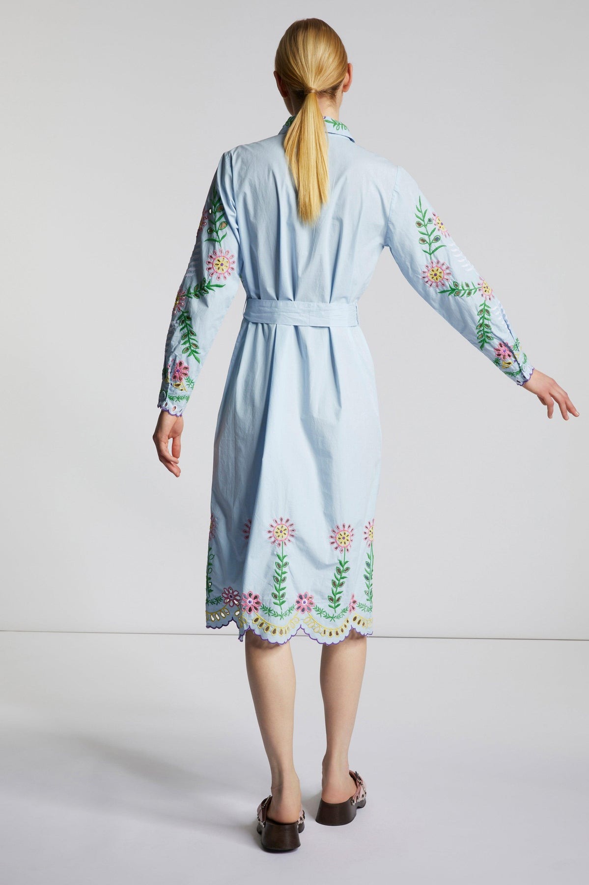 Привлекательность этого устойчивого платья-рубашки — разноцветная вышивка с деталями. Оно имеет непрерывную планку на потайных пуговицах и длинные рукава с манжетами. Пояс на завязках придает А-силуэту платья миди форму талии. Длина в размере 42: 116 см.