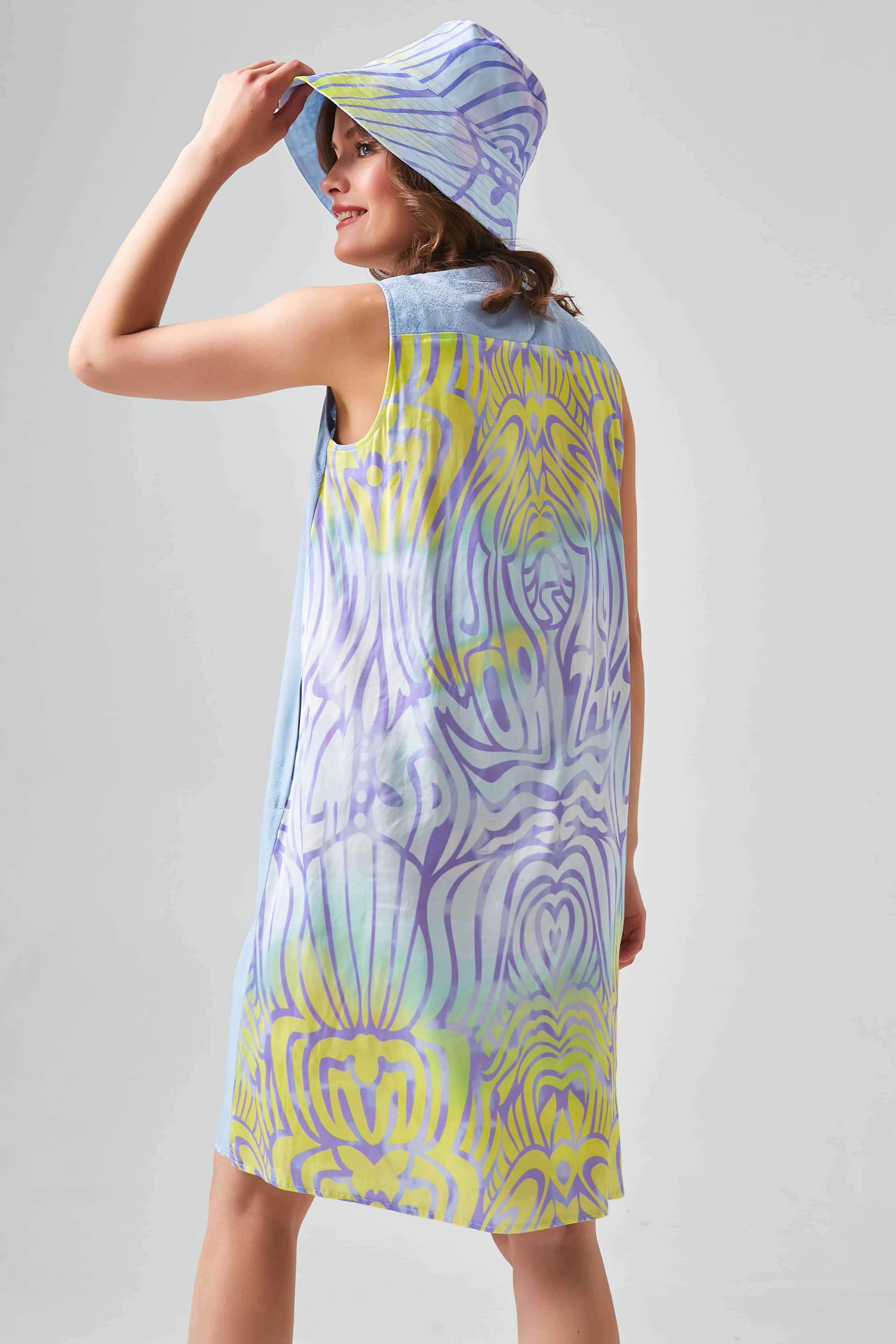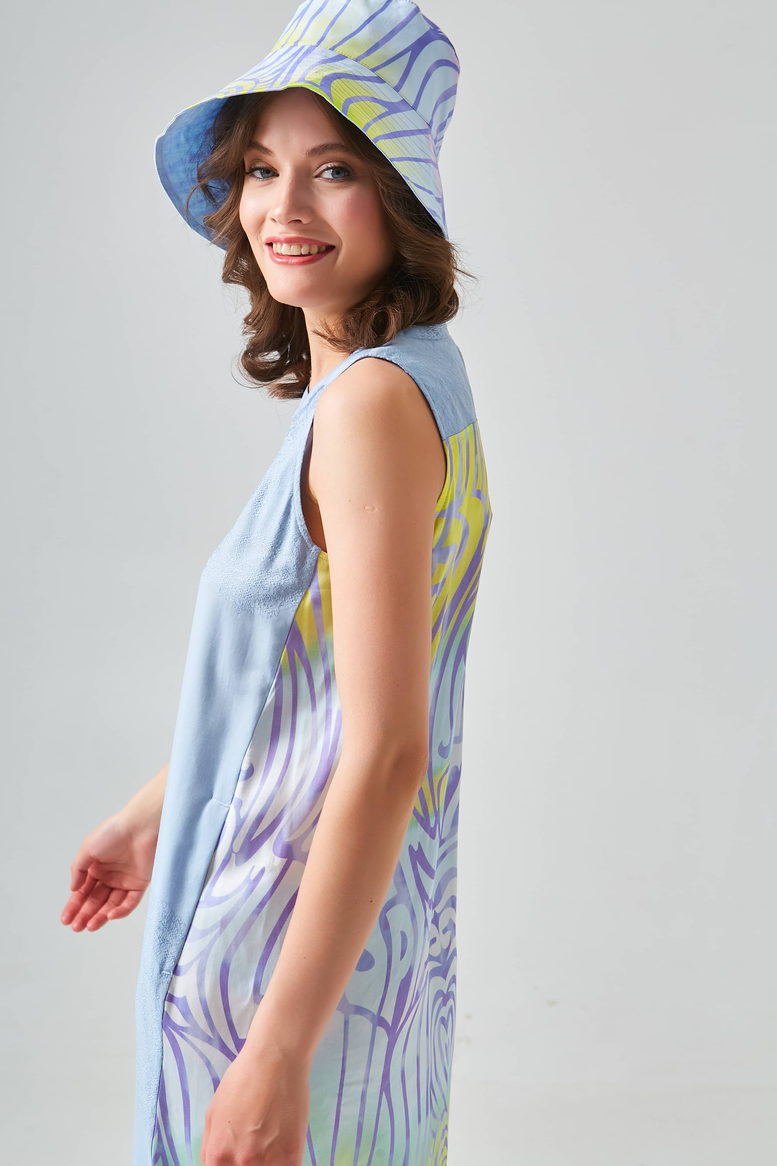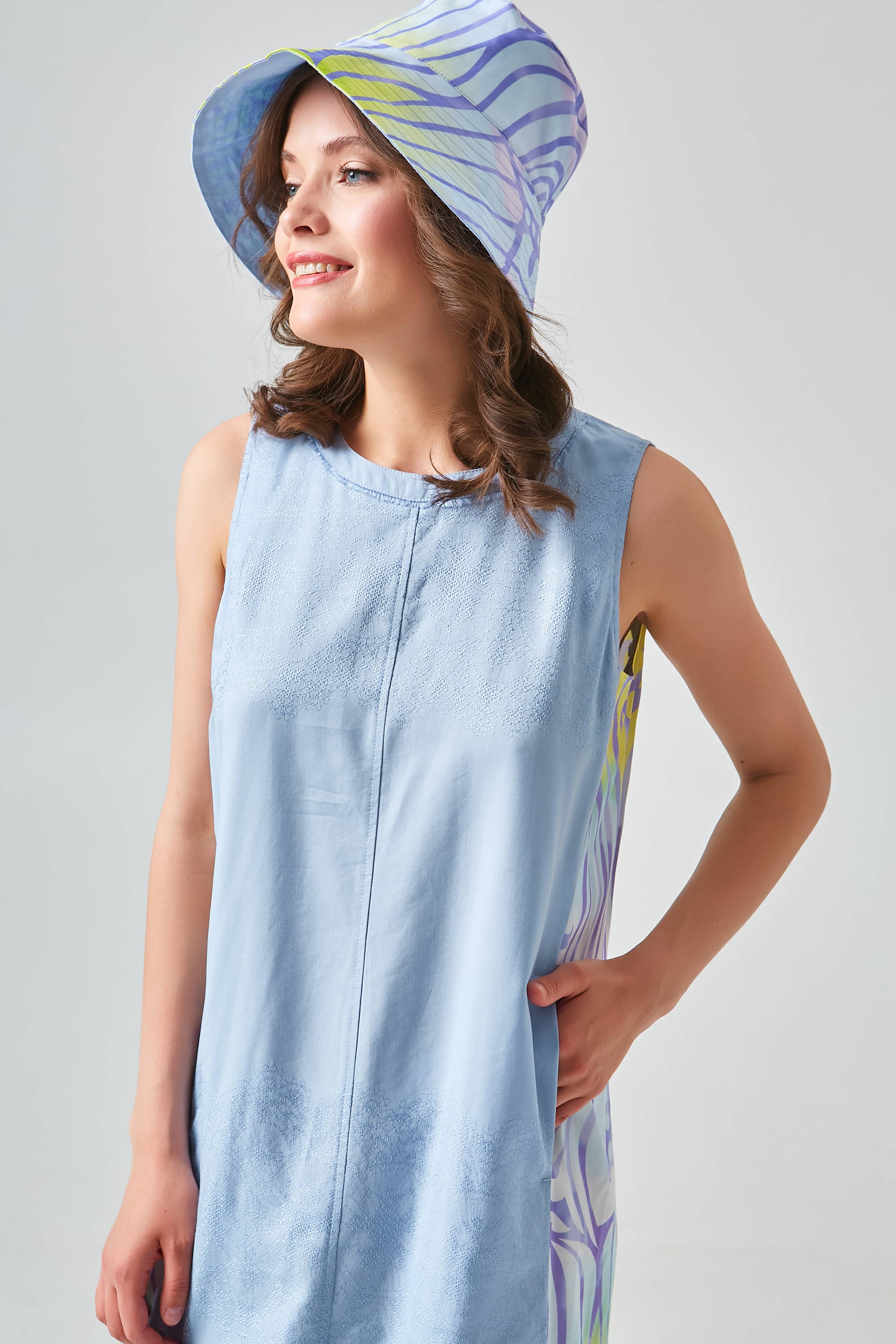Платье без рукавов в сочетании высококачественной ткани Tencel спереди и набивной струящейся атласной ткани сзади позволяет платью комфортно сидеть на теле. Круглый вырез горловины украшен бахромой. Разрез и застежка на пуговице посередине спины.