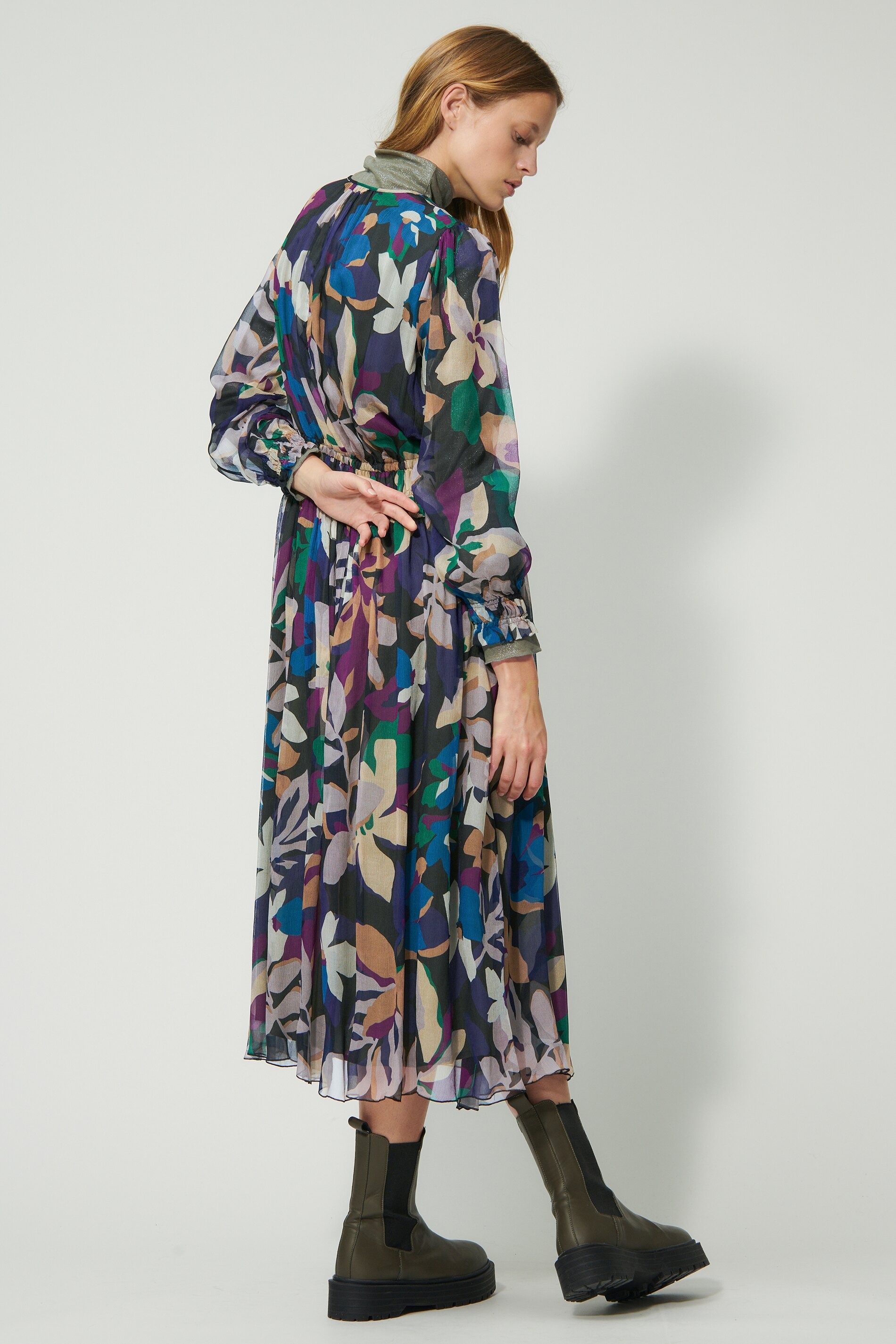 Платье на подкладке из струящегося шелкового крепа с эксклюзивным цветочным узором в зимних тонах. Круглый вырез горловины завязан лентой. Талия и манжеты украшены декоративной сборкой.