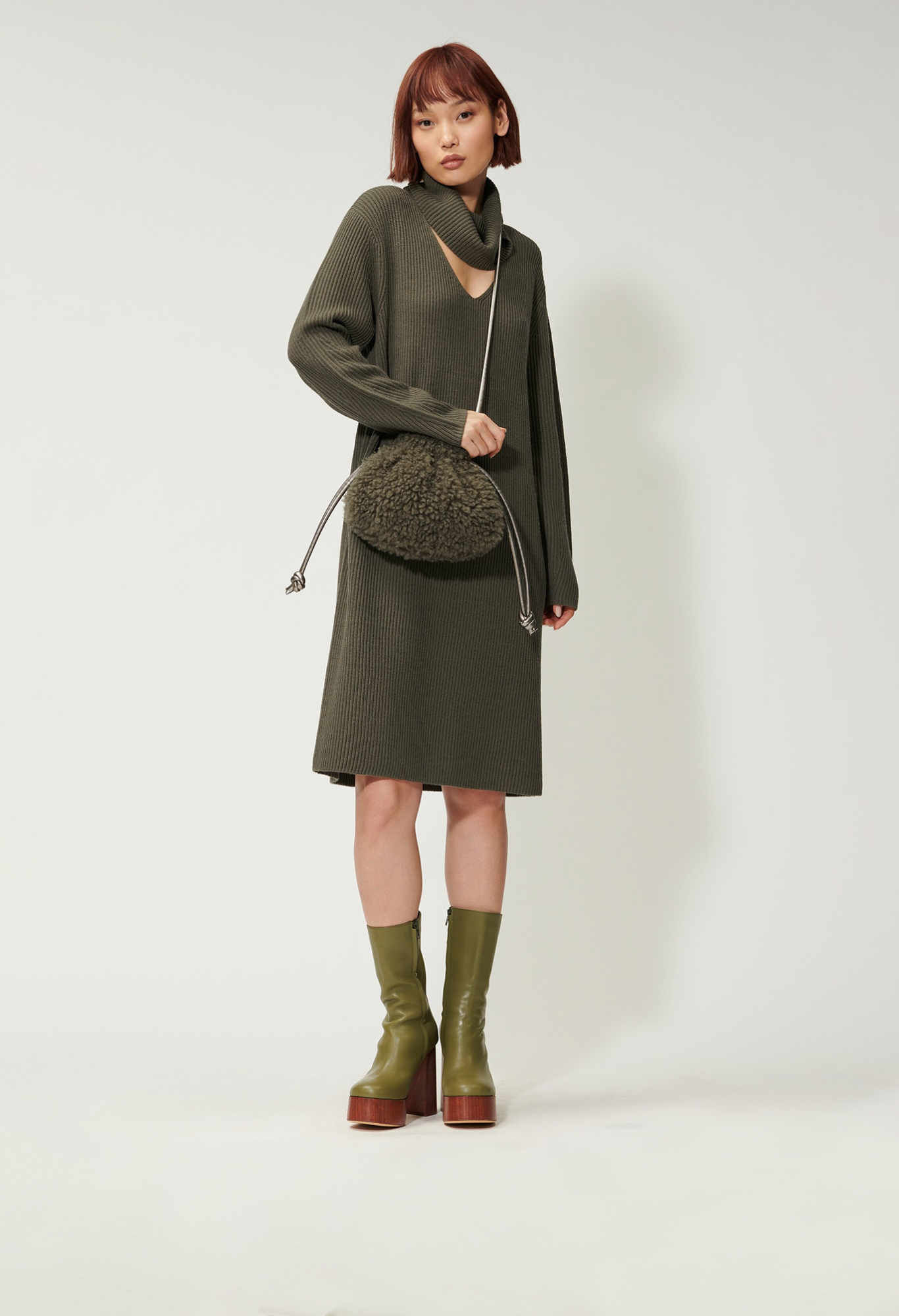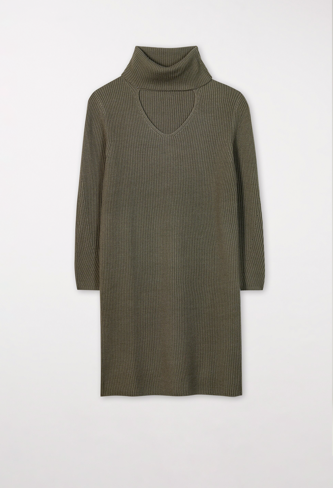 Трикотажное платье средней длины из легкой и приятной на ощупь смесовой шерсти. Платье свободного прямого кроя, с высоким воротником и большим вырезом спереди.