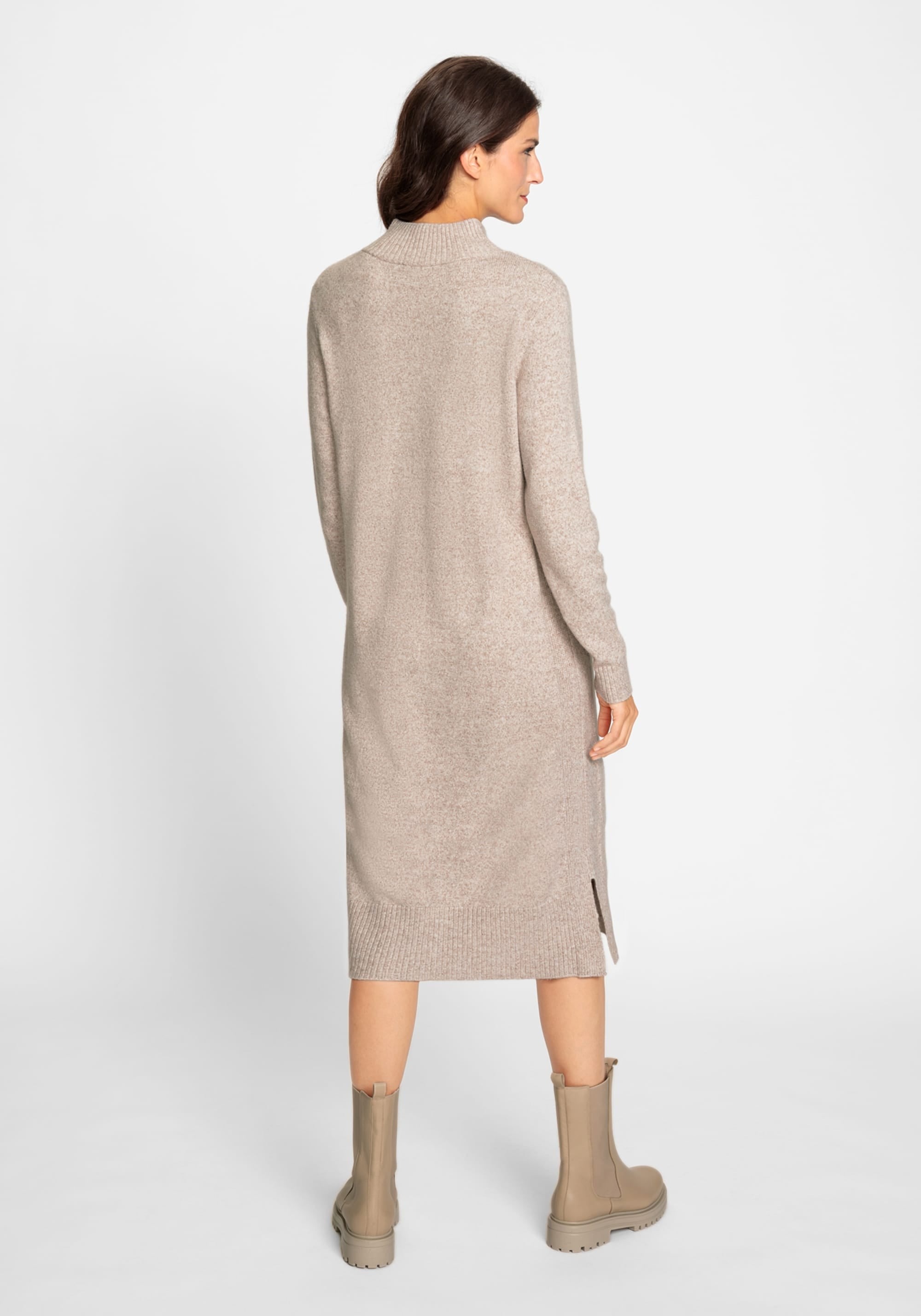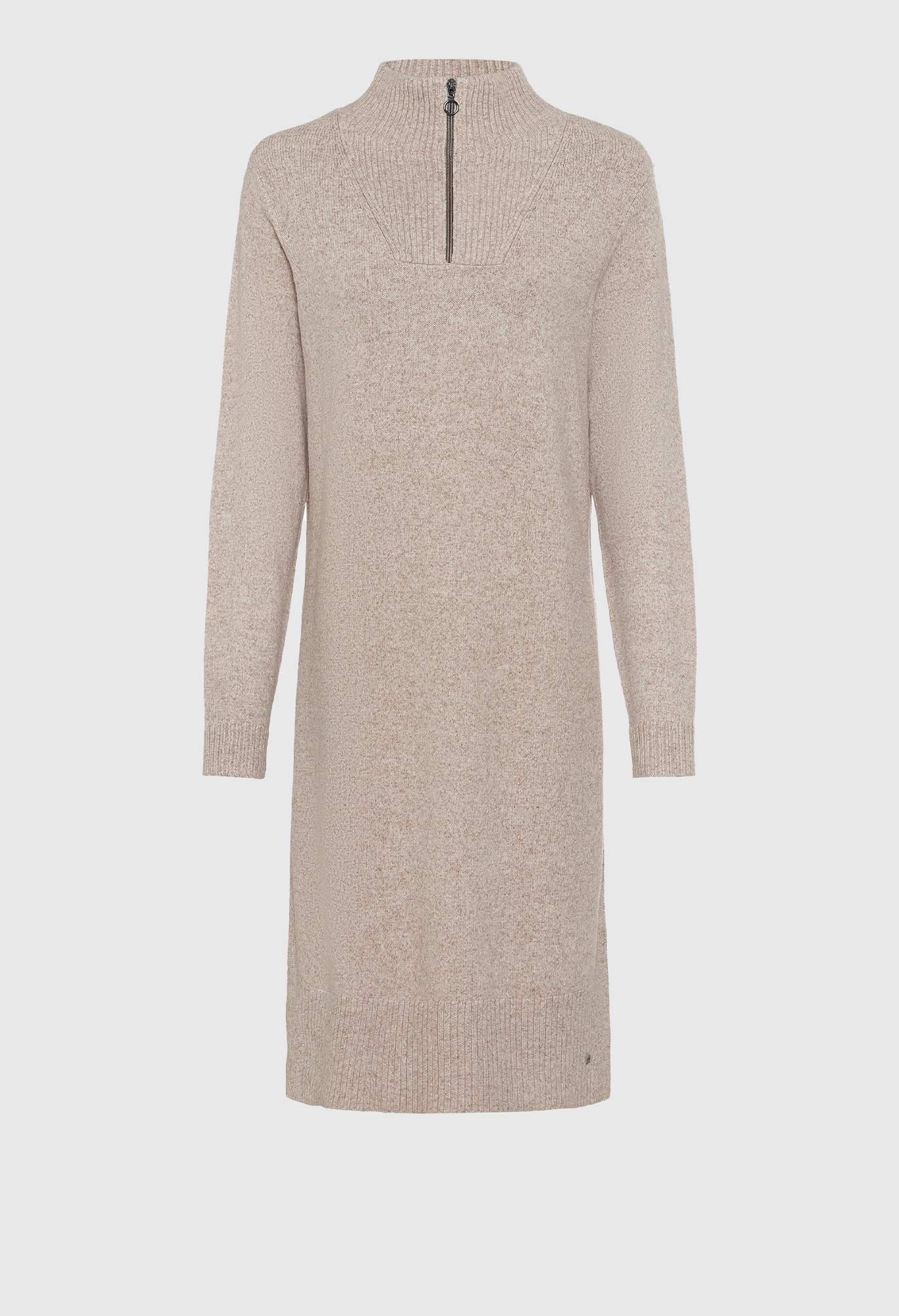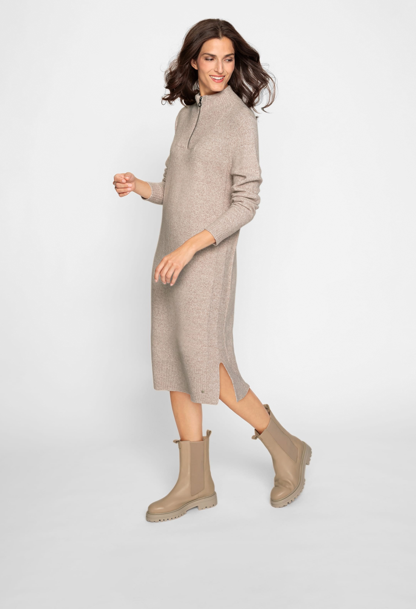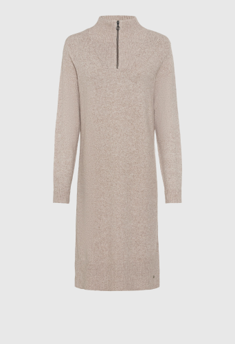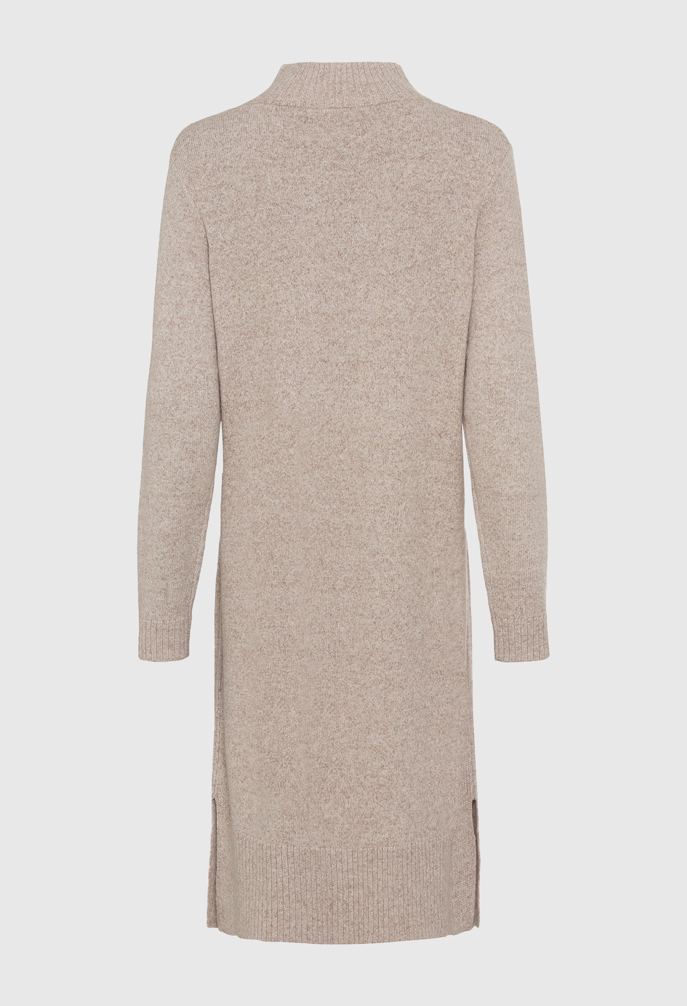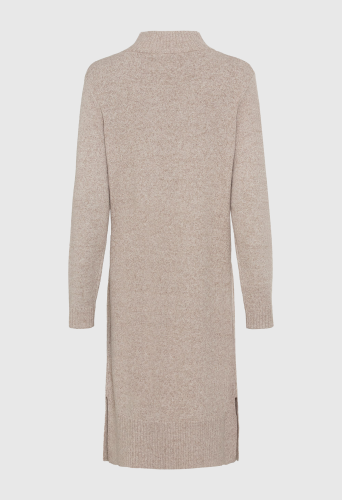 Пряжа создает очень мягкую поверхность классического платья-свитера. Ребристая вязка завершает боковые панели и отделку застежкой-молнией на четверть на шее. Нижняя часть миди с двумя разрезами по бокам.