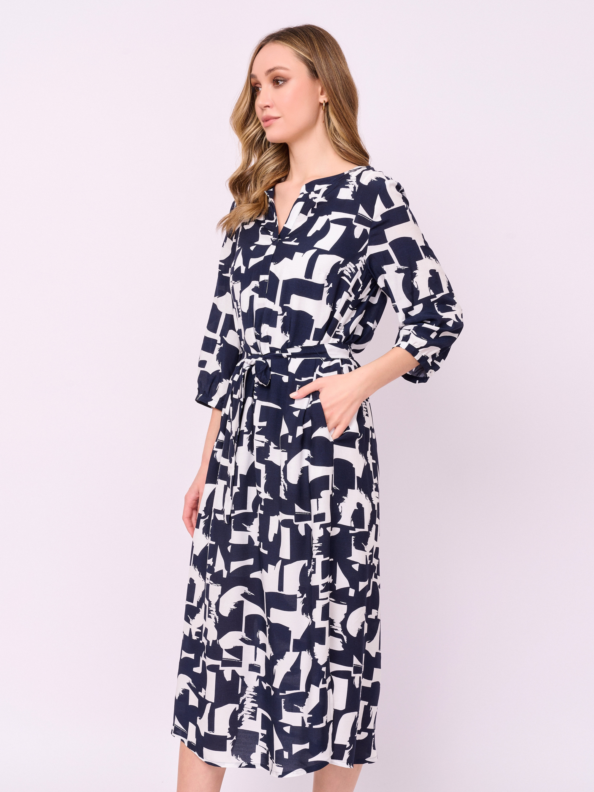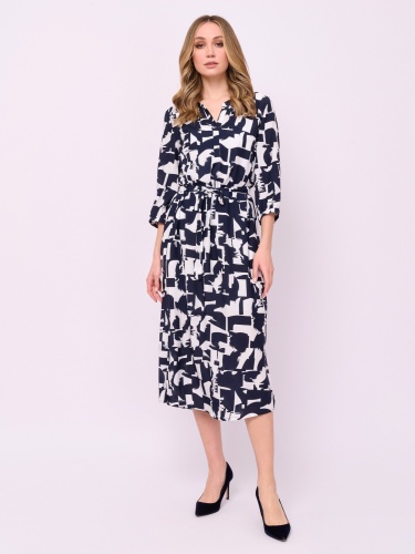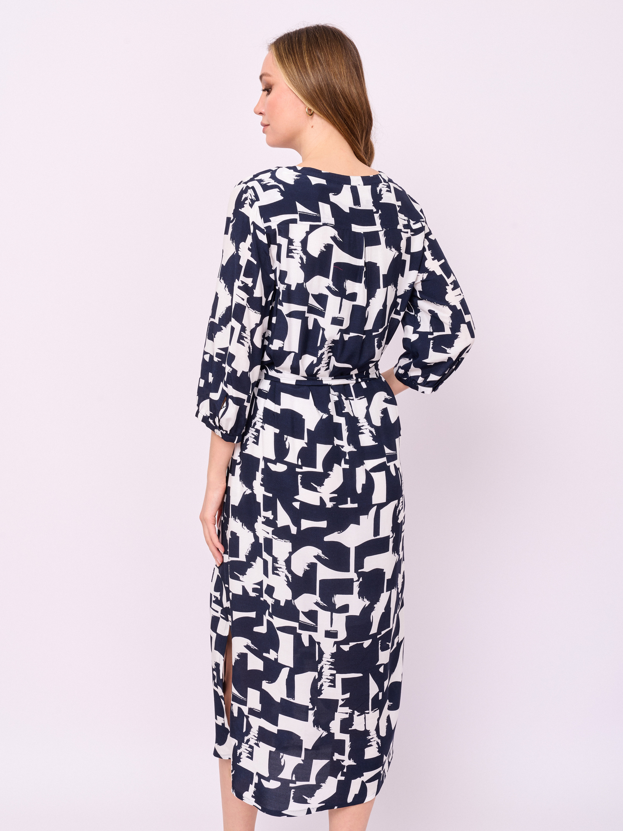 Детали: застежка пуговицы, вырез горловины воротник-стойка, рукава 3/4, покрой прямой, рисунок абстракция, карманы в шве, конструктивные элементы боковые разрезы, длина платья миди, пояс из основной ткани, нижнее платье. Длина по спинке: 119 см