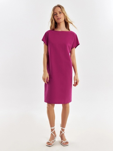 Платье-кокон с горловиной лодочкой, складкой на спине и планкой с имитацией пуговиц. Платье длиной до колена из льняной ткани в ярком цвете цикламен.