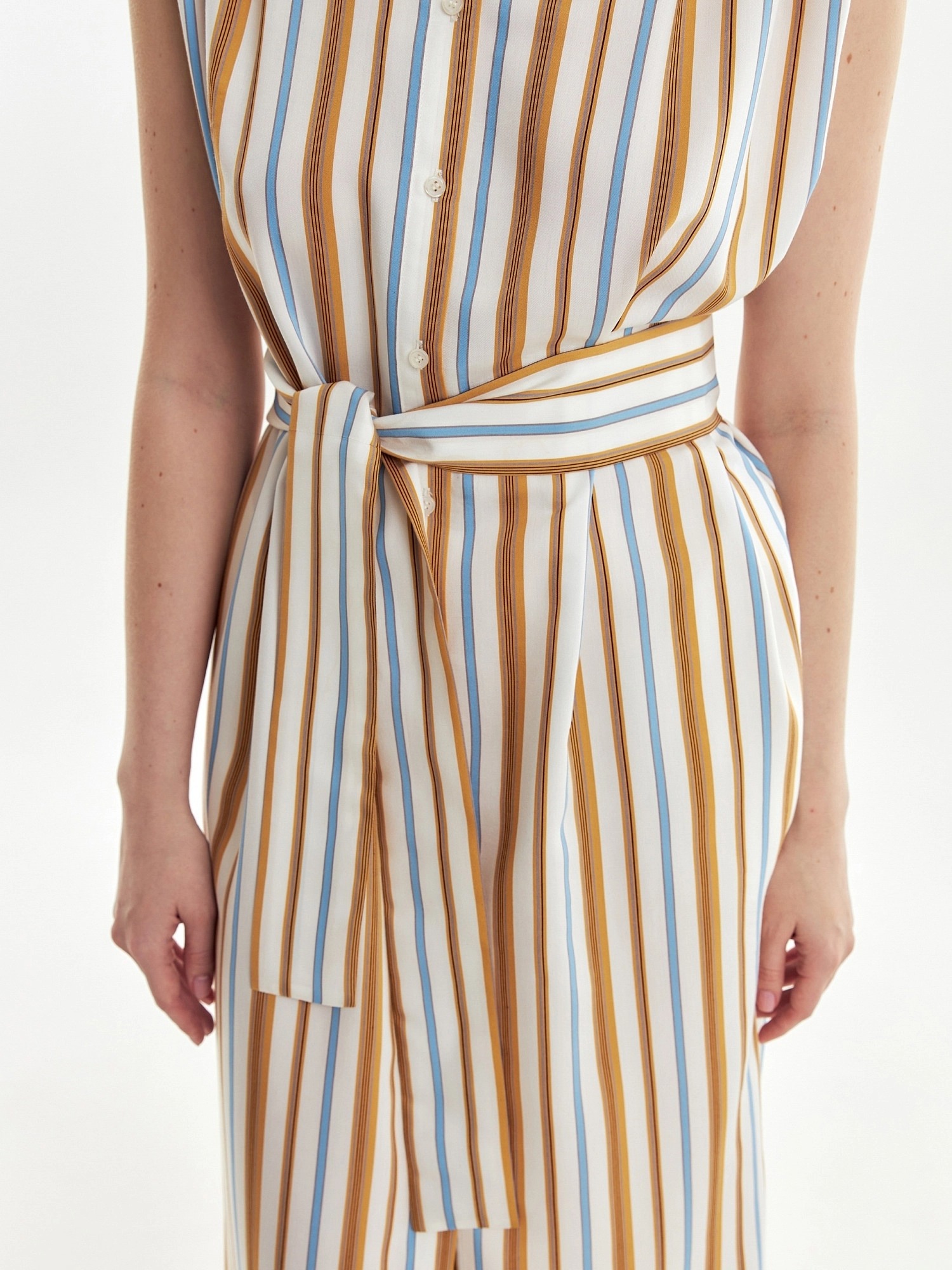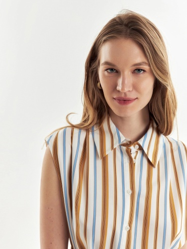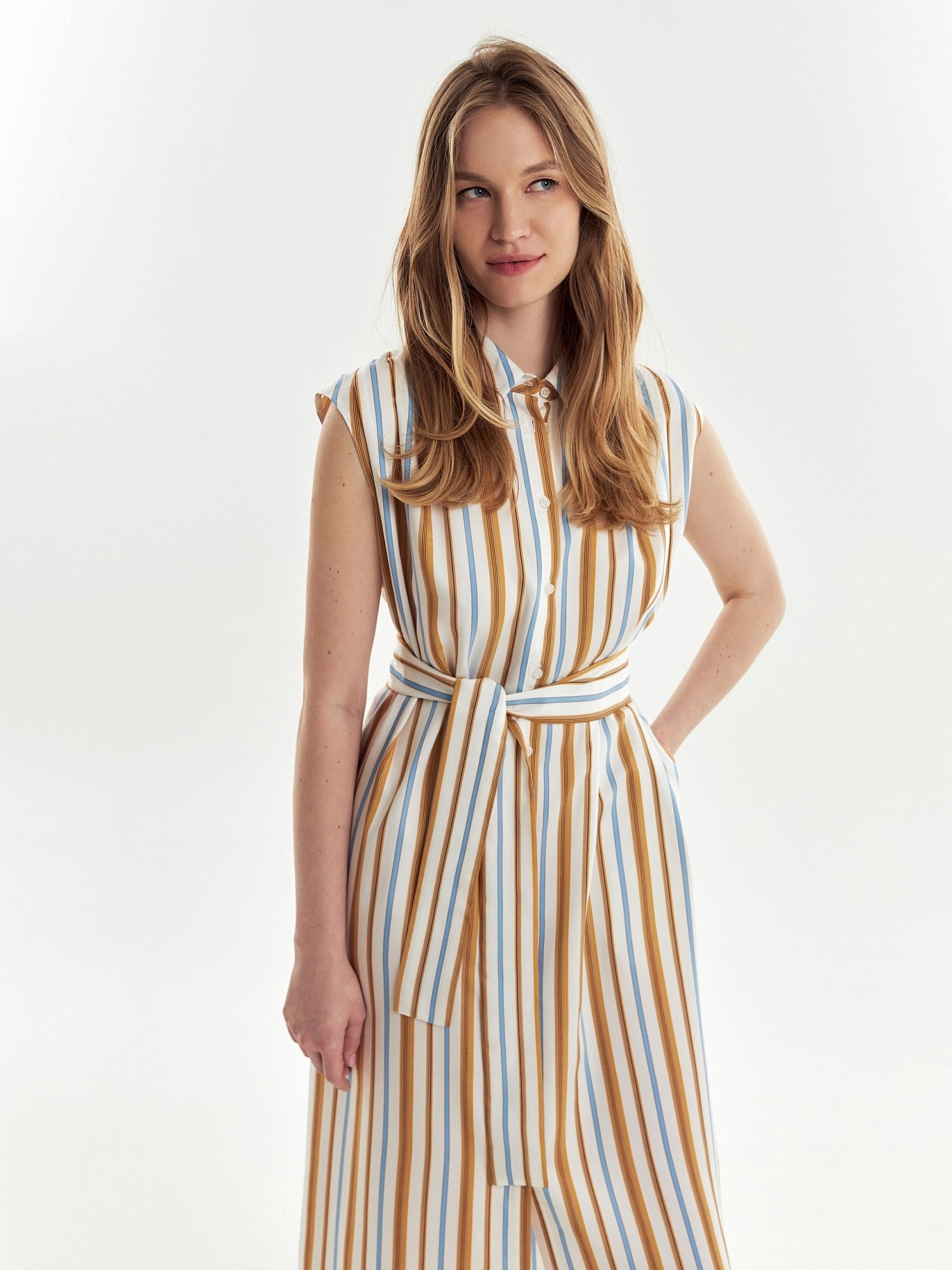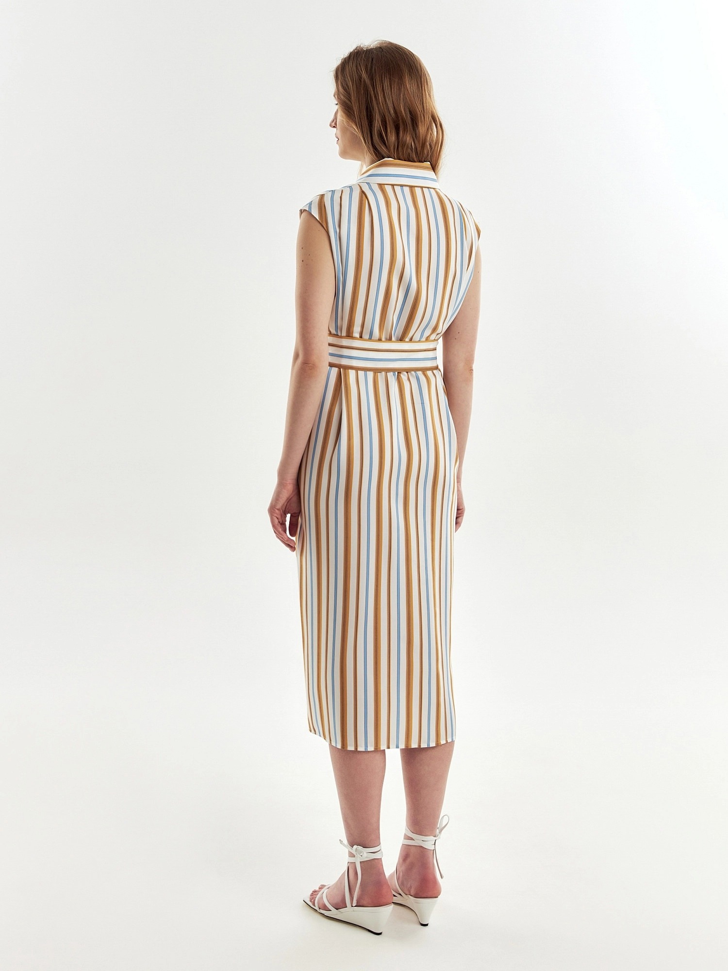 Прямое платье из вискозной ткани в разноцветную полоску с отложным воротником и глубокими складками на плечах. Платье с планкой на пуговицах до груди, от груди складка. В комплект входит пояс из основной ткани. В боковых швах карманы.