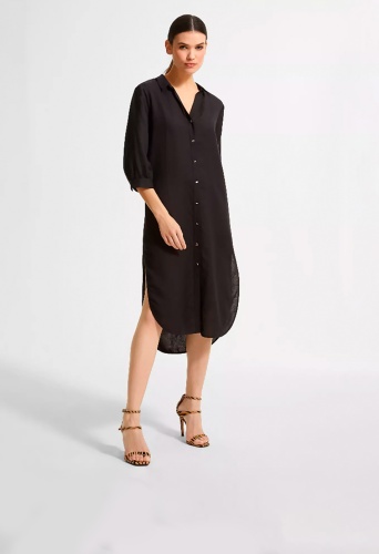Однотонное платье-рубашка прямого кроя. Закругленый срез, удлиненная спинка. Рубашечный отложной воротник, планка с пуговицами. Втачной рукав 3/4 с манжетом.