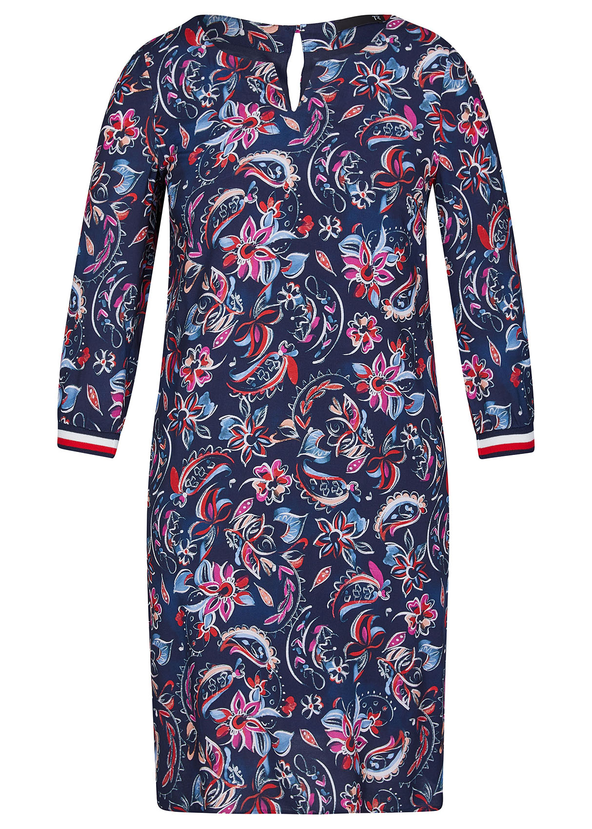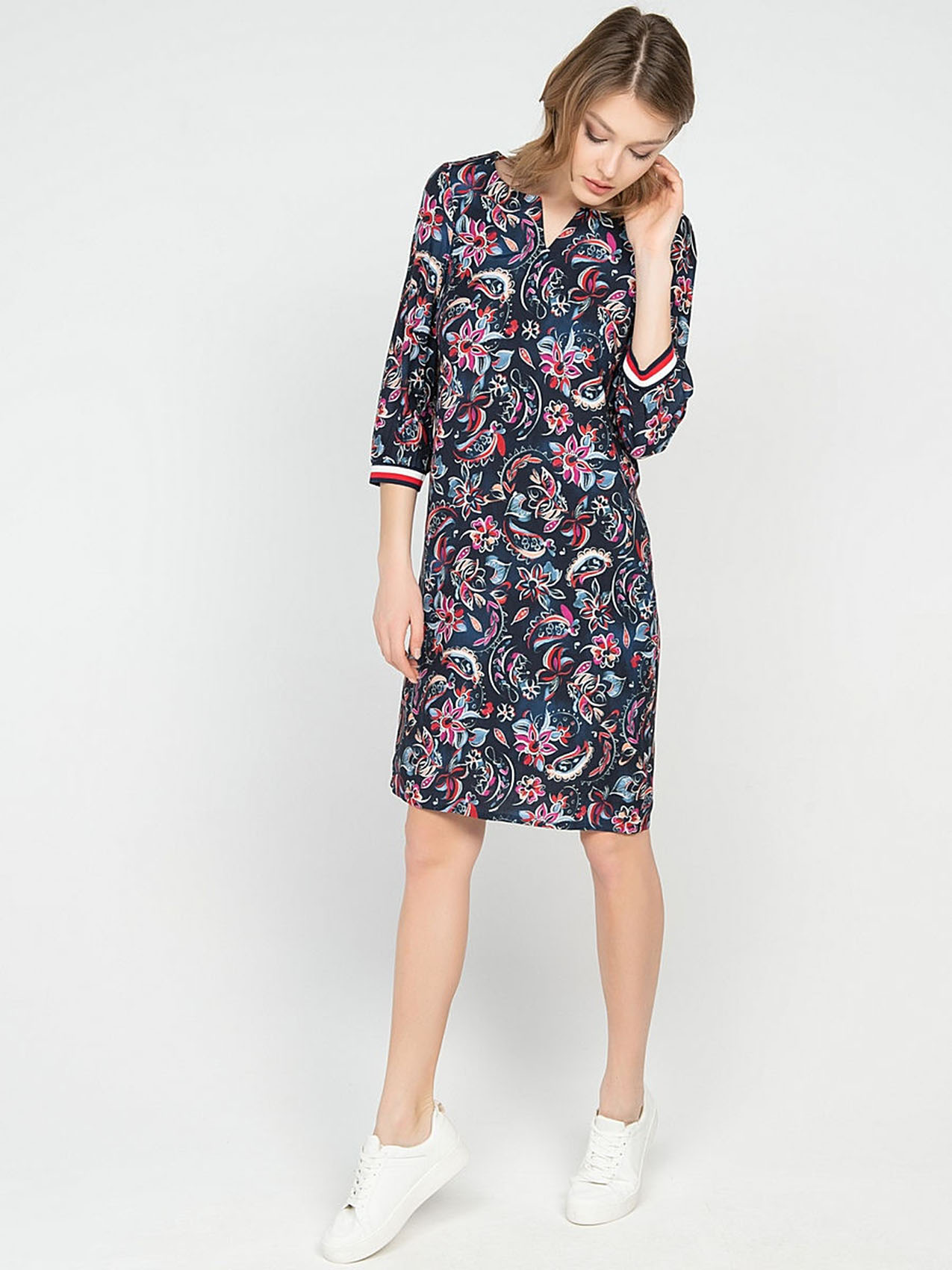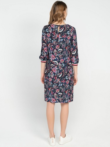 Платье с контрастным цветочным принтом - то, что нужно для летнего образа! Вискозный материал приятен к телу, а прямой покрой обеспечивает максимальный комфорт. Рукава 3/4 оканчиваются трикотажными манжетами. Завершенность дизайну придает фигурный вырез горловины. Стильное платье в сочетании со спортивной обувью создает современный образ. Длина изделия по спинке - 98 см.