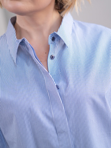 Хлопковое платье-рубашка свободного кроя. Длина миди. Отложной рубашечный воротник. Короткий втачной рукав с отворотом. Застежка на пуговицы.