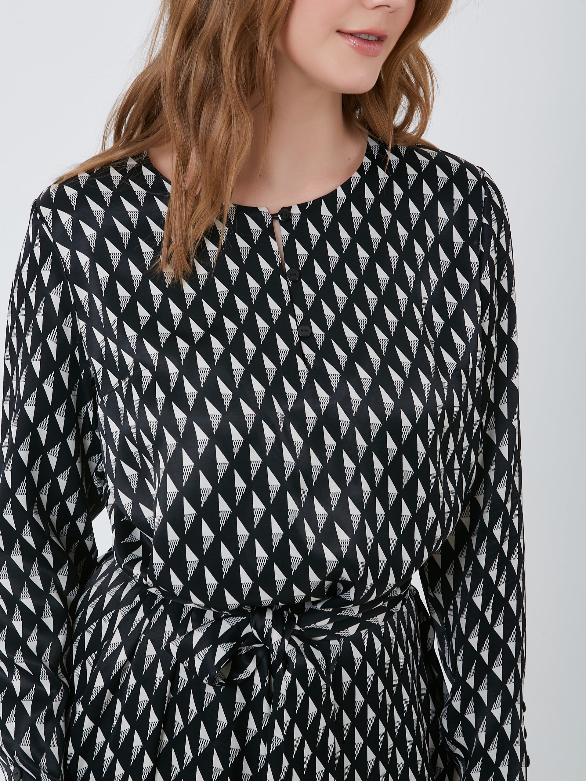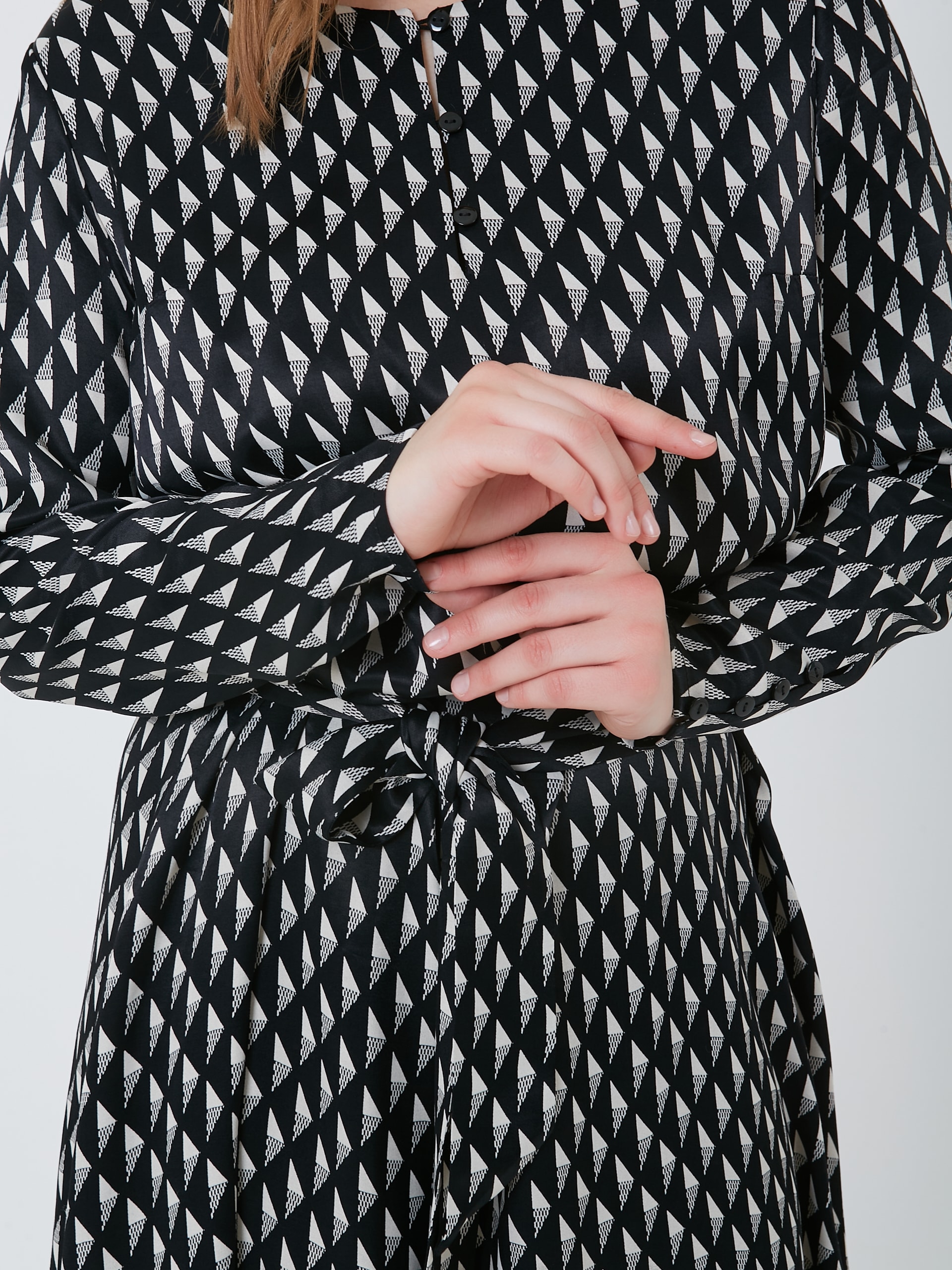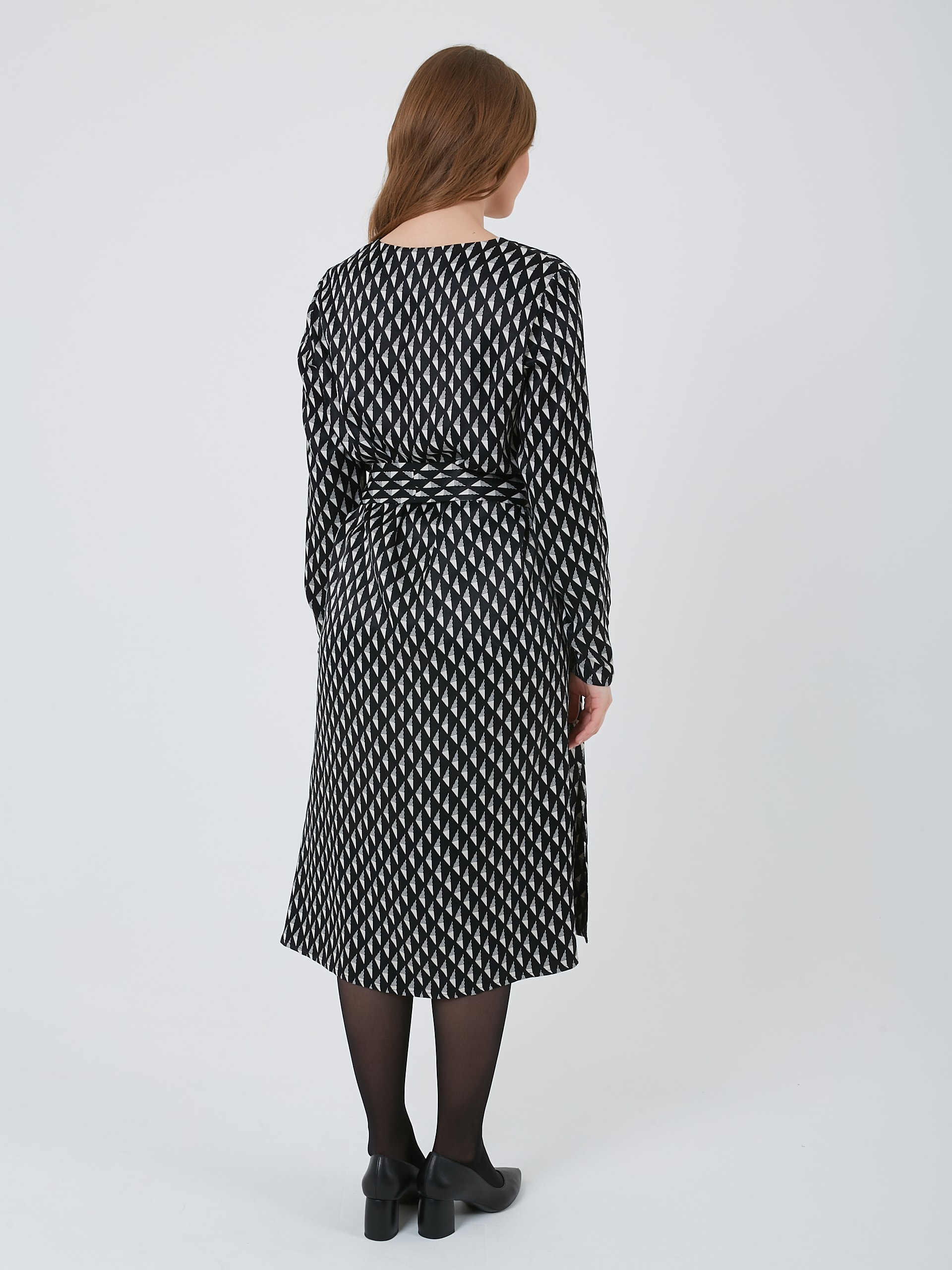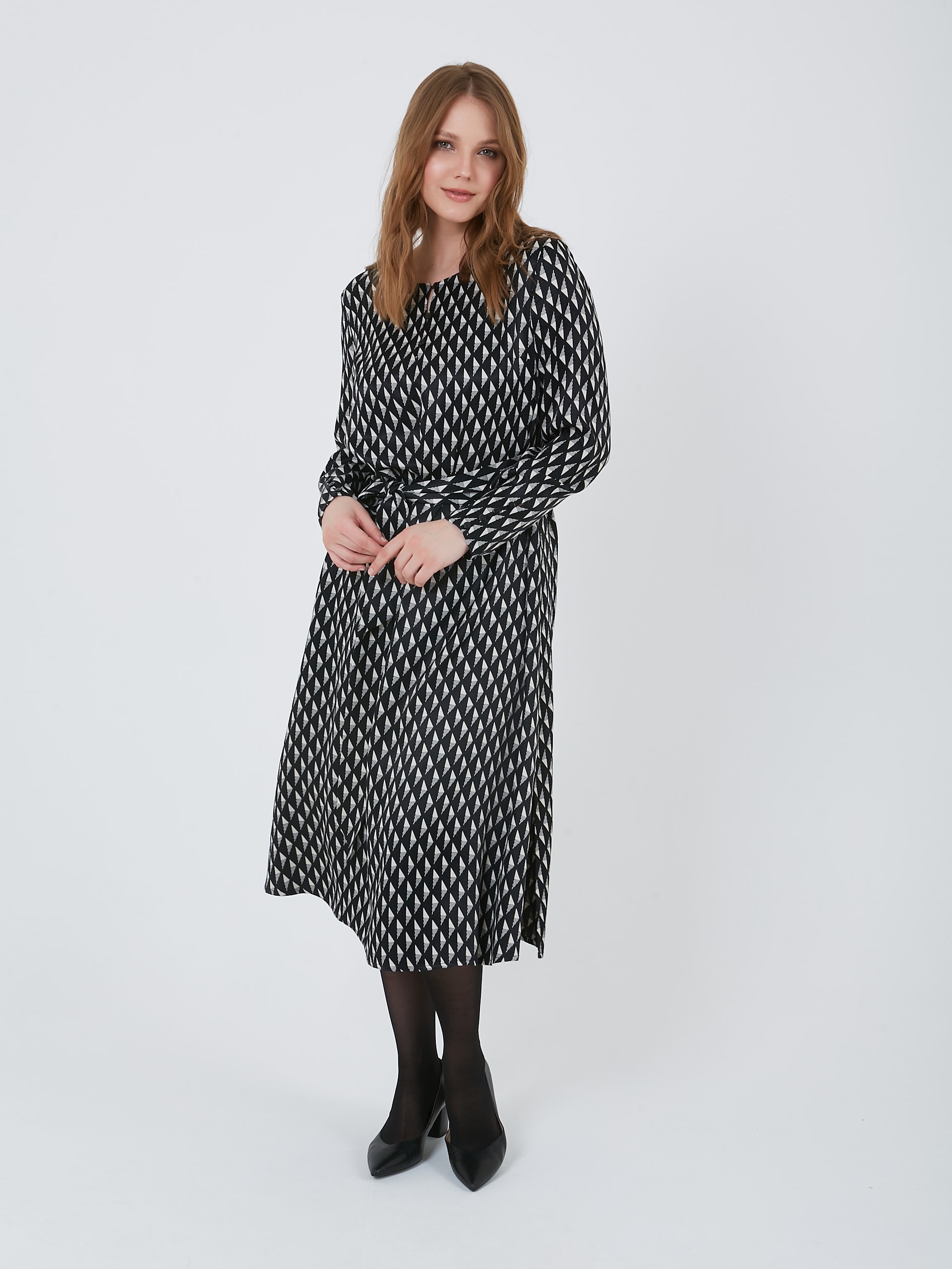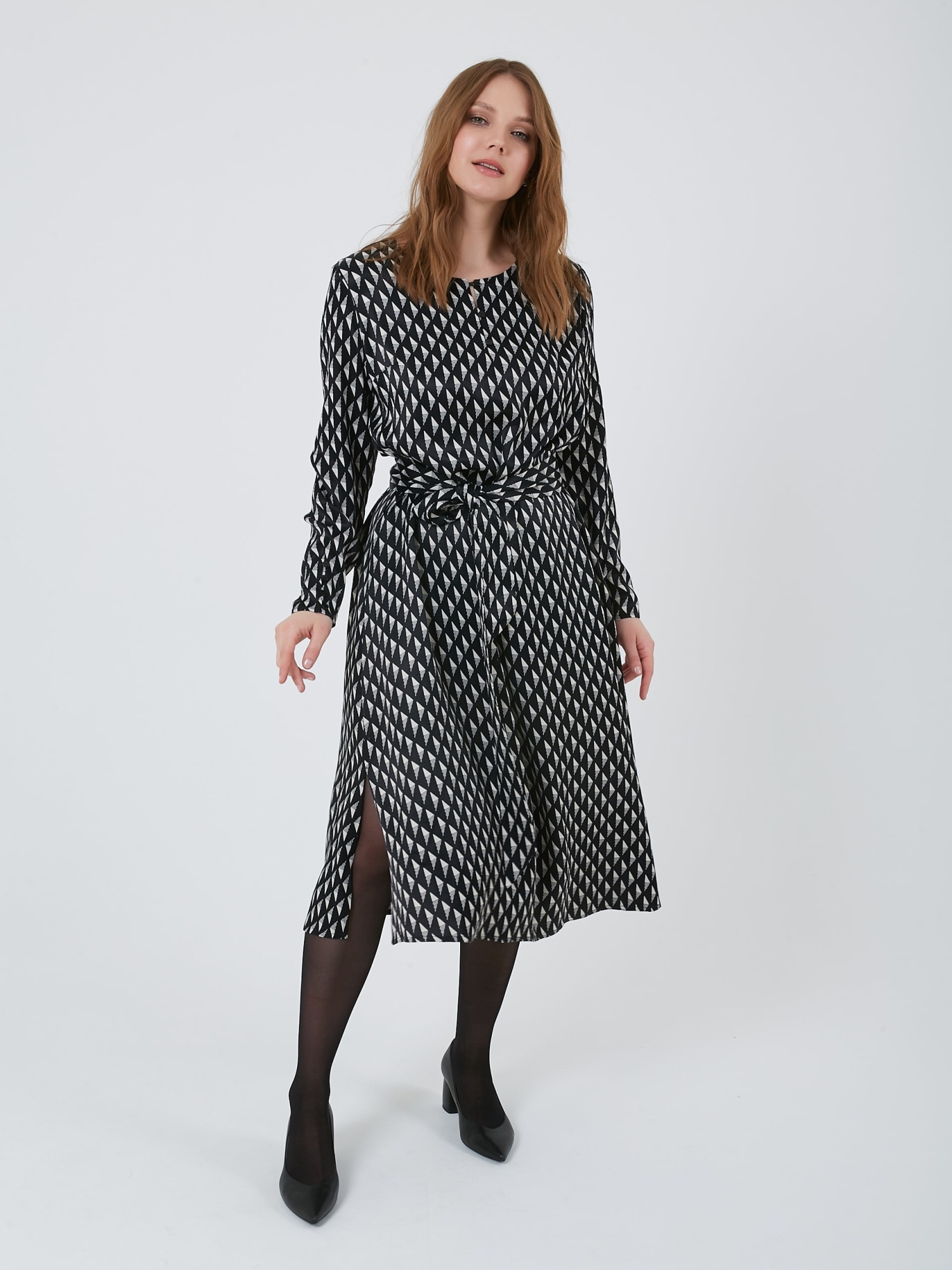 Комфортное чёрно-белое платье из вискозы с геометрическим принтом. Свободного кроя с поясом в комплекте. Коллекция Осень-Зима 2024-2025. Капсула "Амели".