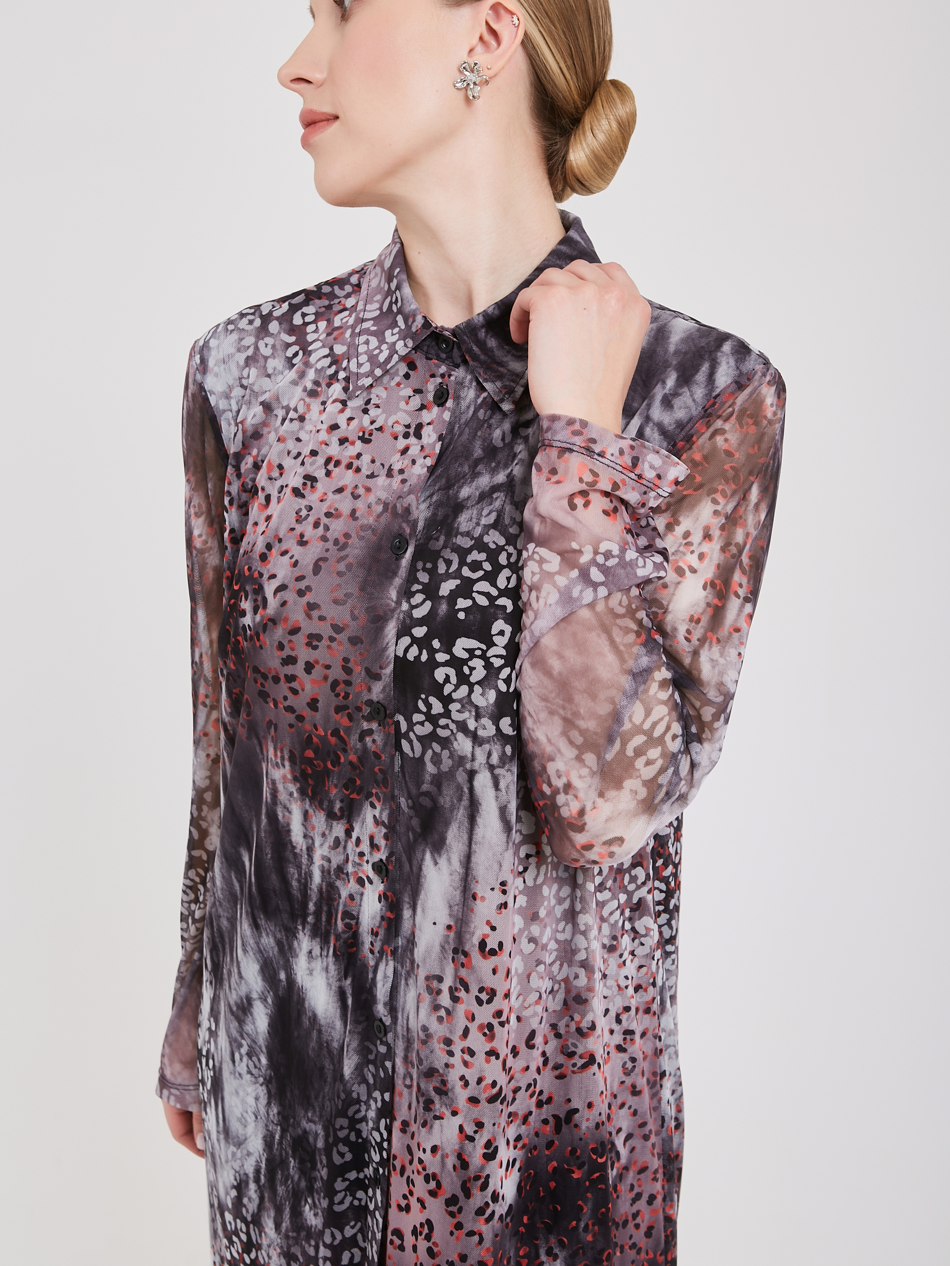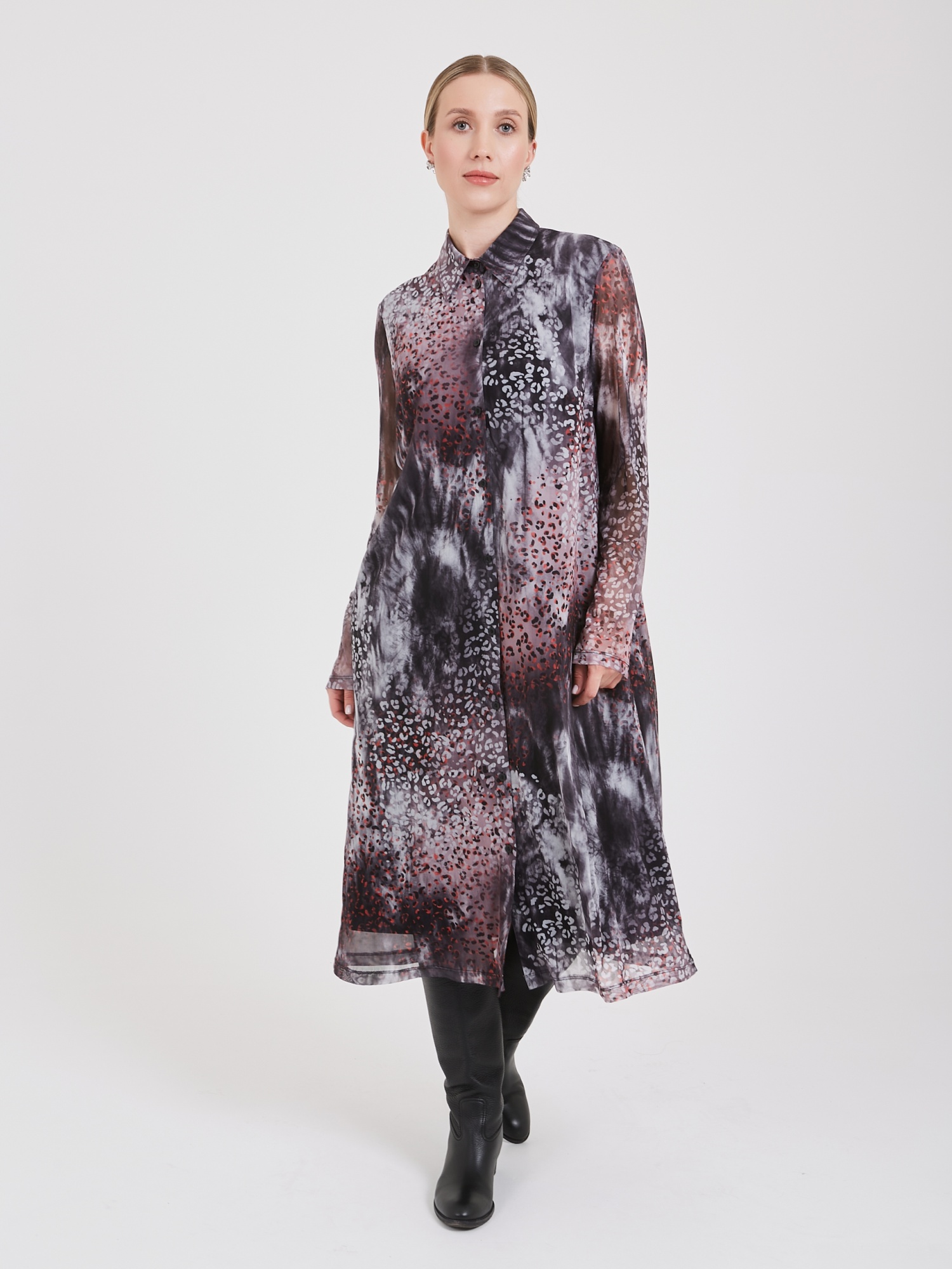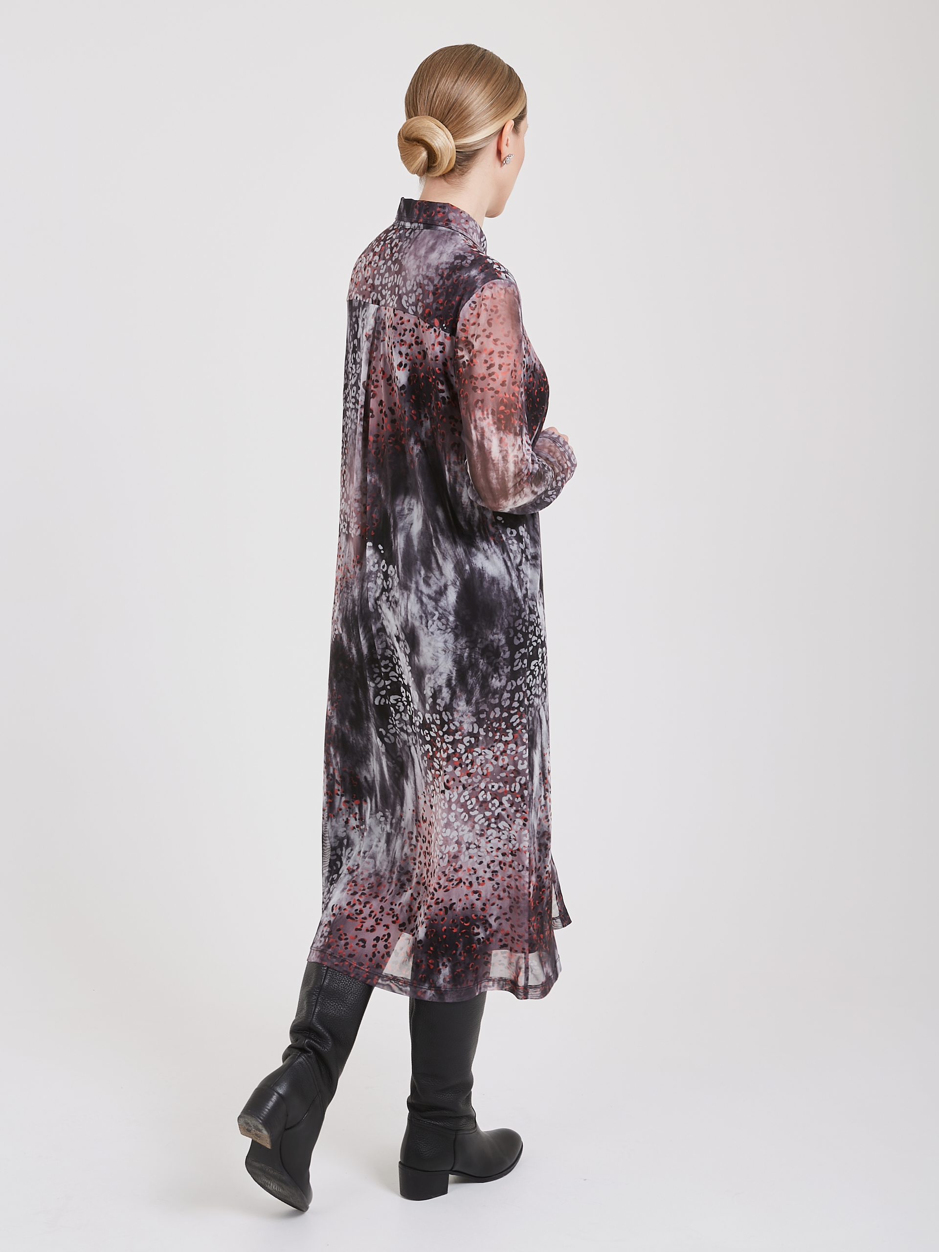Женское длинное полупрозрачное платье с оригинальным принтом, сочетающим пятнистый узор и размытые пятна черного, розового и белого оттенков. Длинные рукава и воротник-стойка придают образу изысканность и утонченность. Легкий струящийся материал подчеркивает женственность и создает ощущение воздушности. Осень-Зима'25/26. Капсула "Вишневый сад"