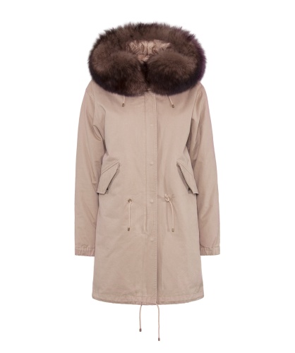 Теплое пуховое пальто прямого кроя. Плотная ткань верха. Кулиска на талии. Карманы пальто на клапанах. Пата с пуговицей по низу рукавов. Кулиска по низу изделия. Оторочка капюшона из натурального лисьего меха.