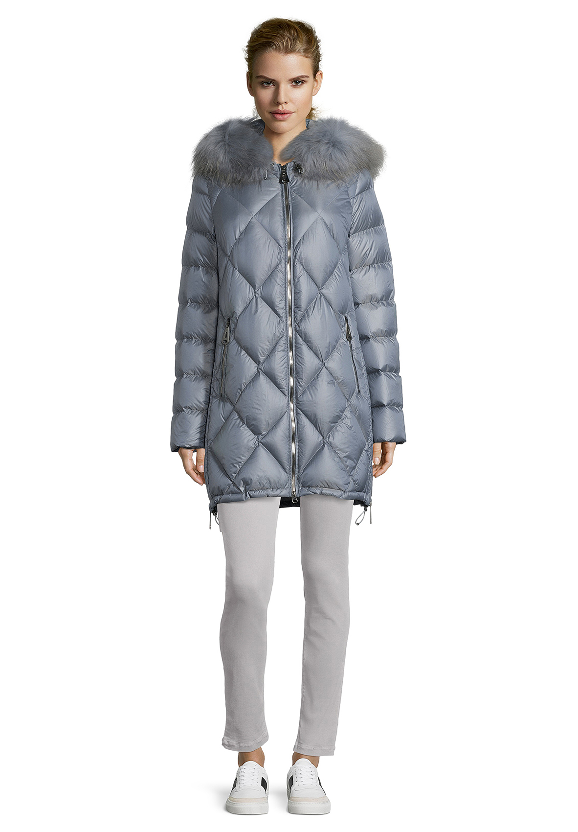 Пуховое пальто прямого покроя. Длина до середины бедра, капюшон на кулиске, двойная застежка-молния, карманы на молниях. Низ изделия на кулиске, что позволяет регулировать прилегание пуховика. Материал верха отлично защищает от ветра и влаги. Отделка капюшона из натурального меха енота придает образу истинный шик.